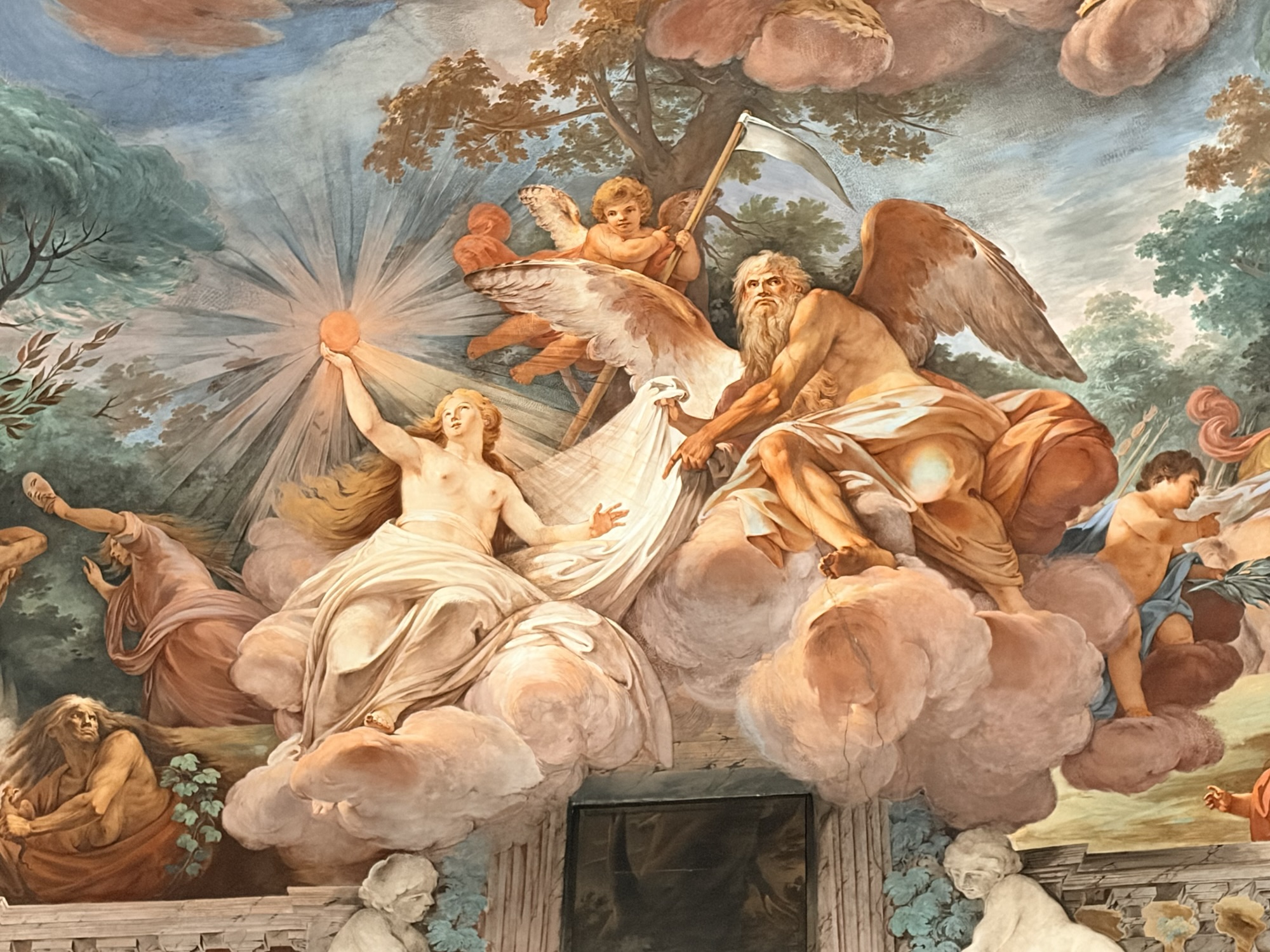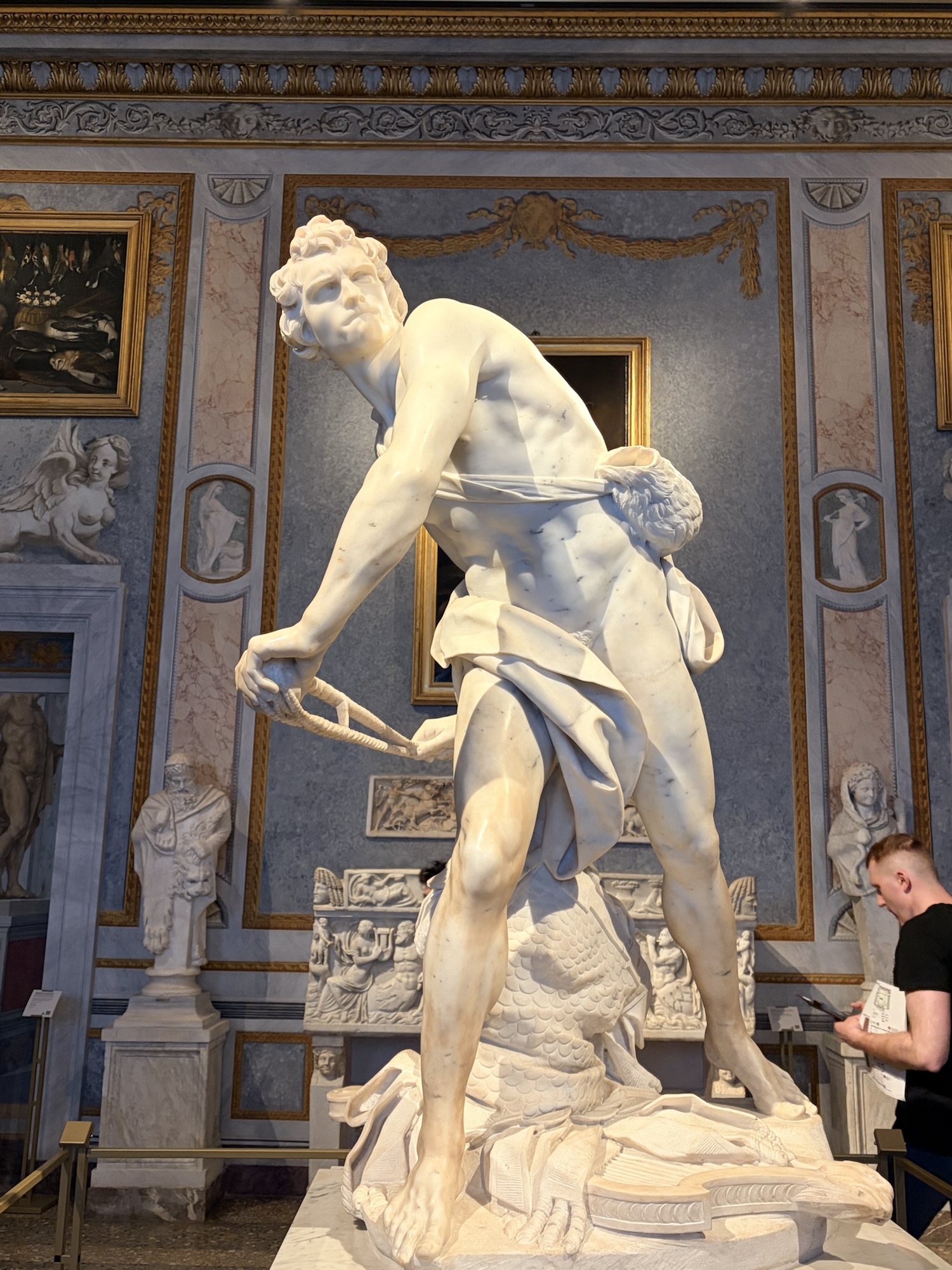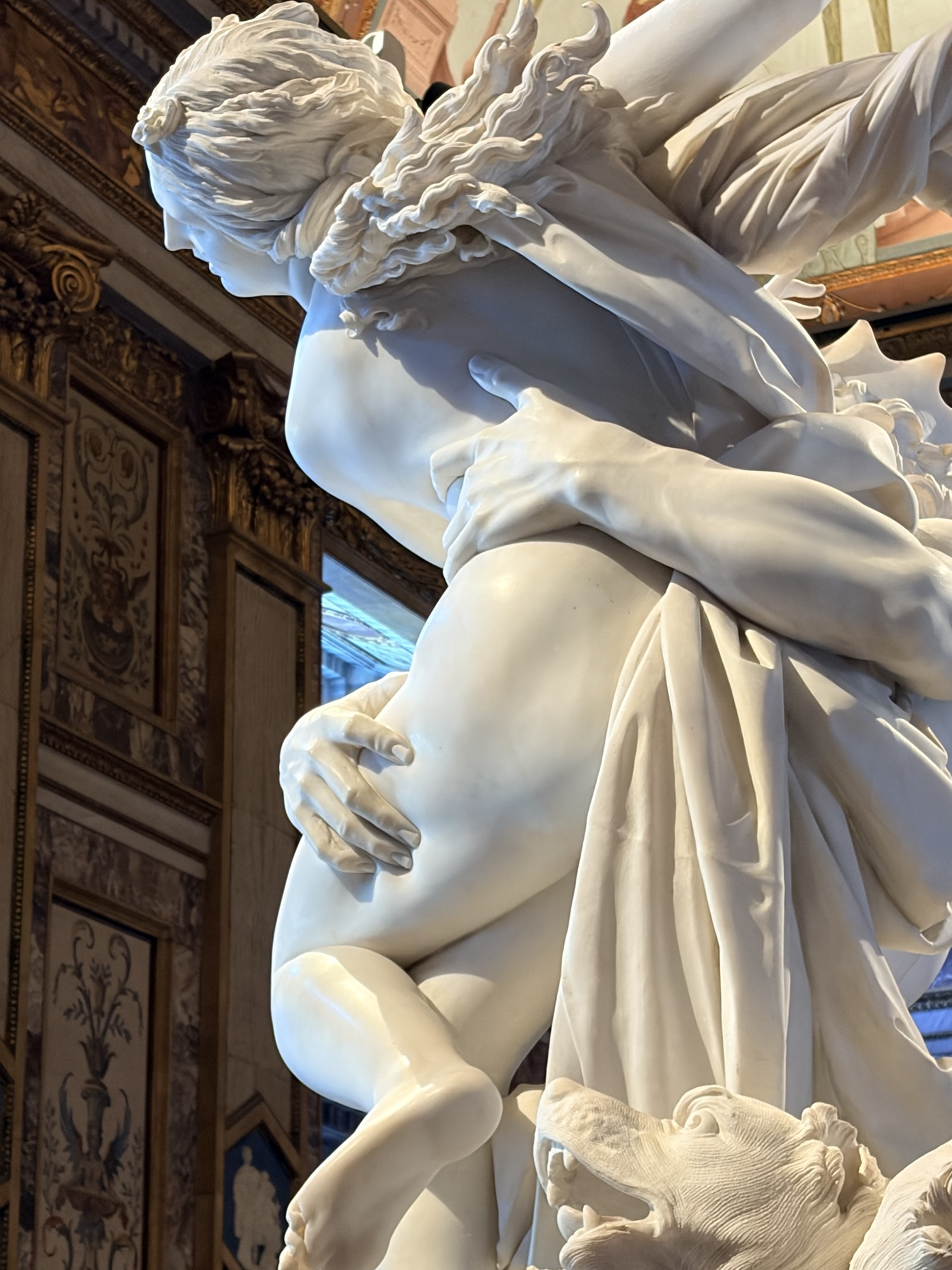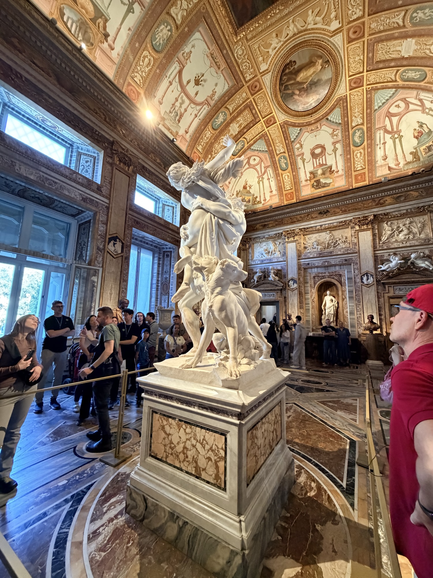 Our first booked tour was of this private family art museum from the 1600’s. If you have read any of my trip reports you know we love museums and this was spectacular. Much smaller than Musee d’Orsay or the Louvre or the Uffizi, it is overwhelming nonetheless with rooms decorated with frescoes, paintings, finely detailed mosaics (I thought they were paintings until I looked closely) and stunning marble sculpture. We were not so familiar with Bernini and we were wowed over and over. The Rape of Persephone, terrifying…but not as terrifying as Apollo and Daphne, showing her transformation into a laurel tree at the moment Apollo touches her. Those Greek myths are not kind when it comes to forcing young women to submit to the gods who want them. Bernini’s skill at depicting movement turns cold white marble into hot violence.