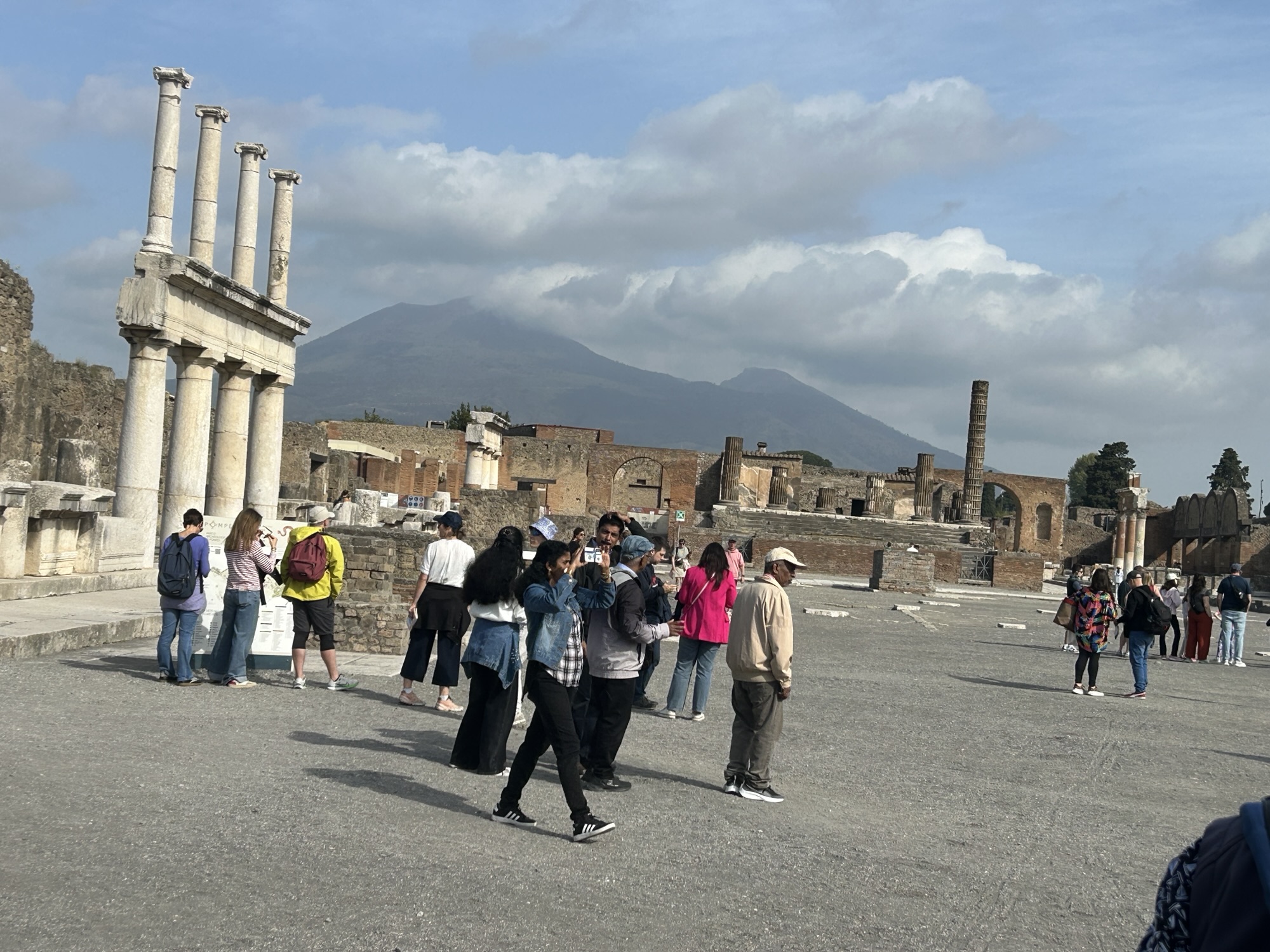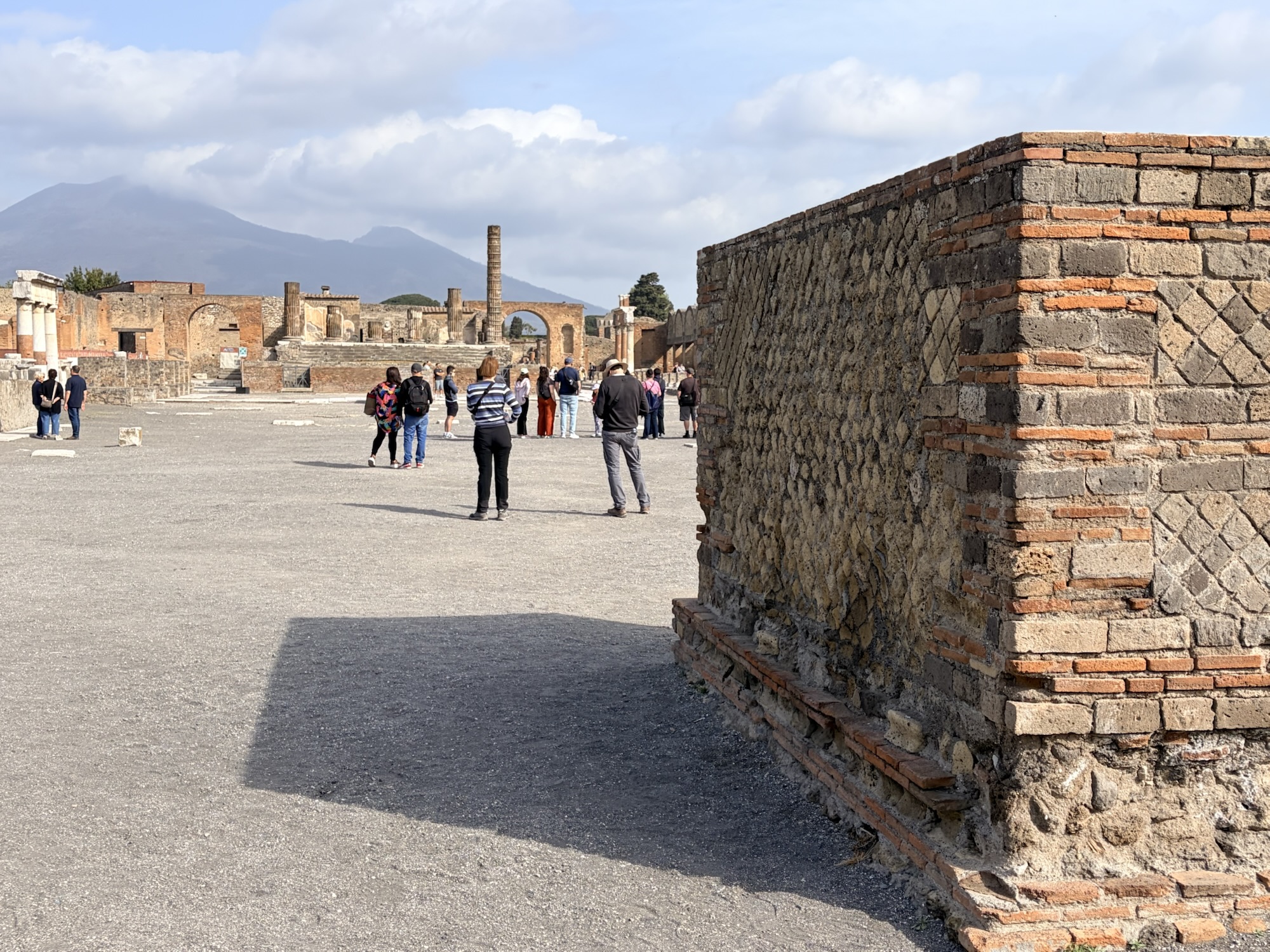 After four hours at the archeological museum we felt a bit over-prepared for our visit to Pompeii. Assuming we’d be well acclimated to Italy, over any jet lag, and sleeping well we had booked a 9am start for a 3 hour tour with a professional archeologist as our guide. This meant getting up quite early, hopping the Metro to Garibaldi Piazza and station, finding the local Circumvesuviana train to Pompeii, and amazingly everything went perfectly. We even made a friend on the train, an American now living in Portugal, in Naples for a conference and winding up her stay with a trip to Pompeii. She now helps people relocate to Europe. I have her card in case, well, you know.