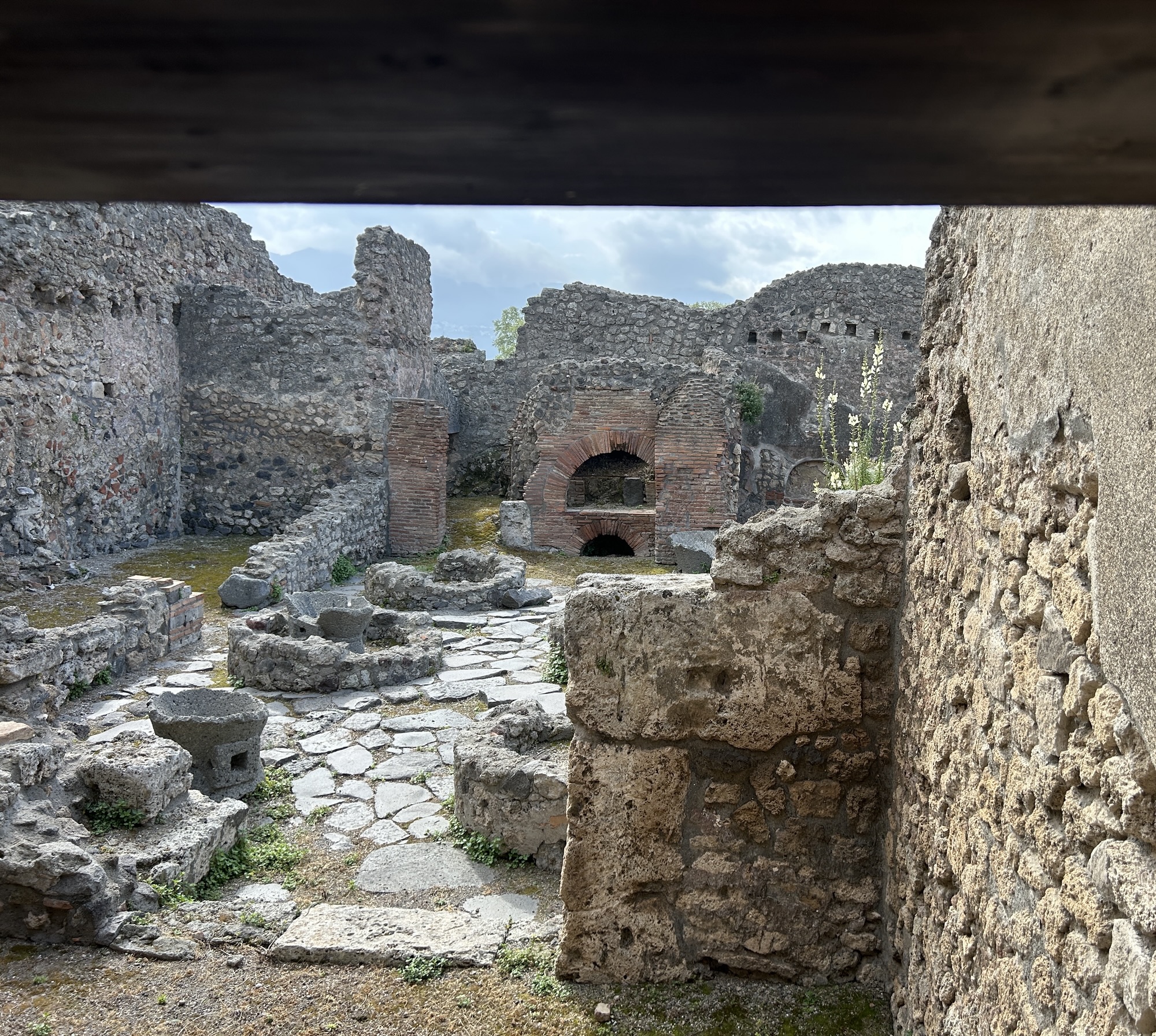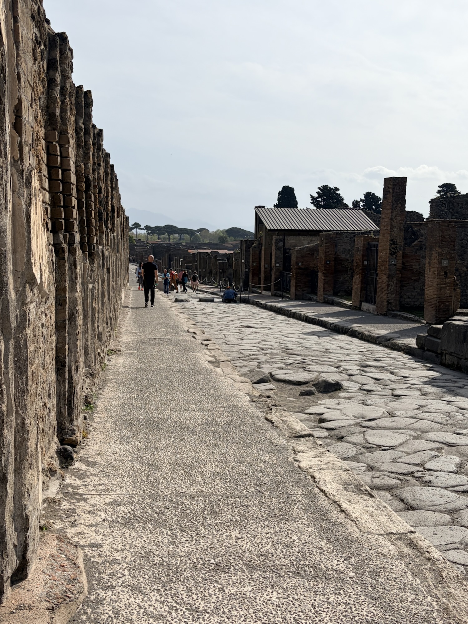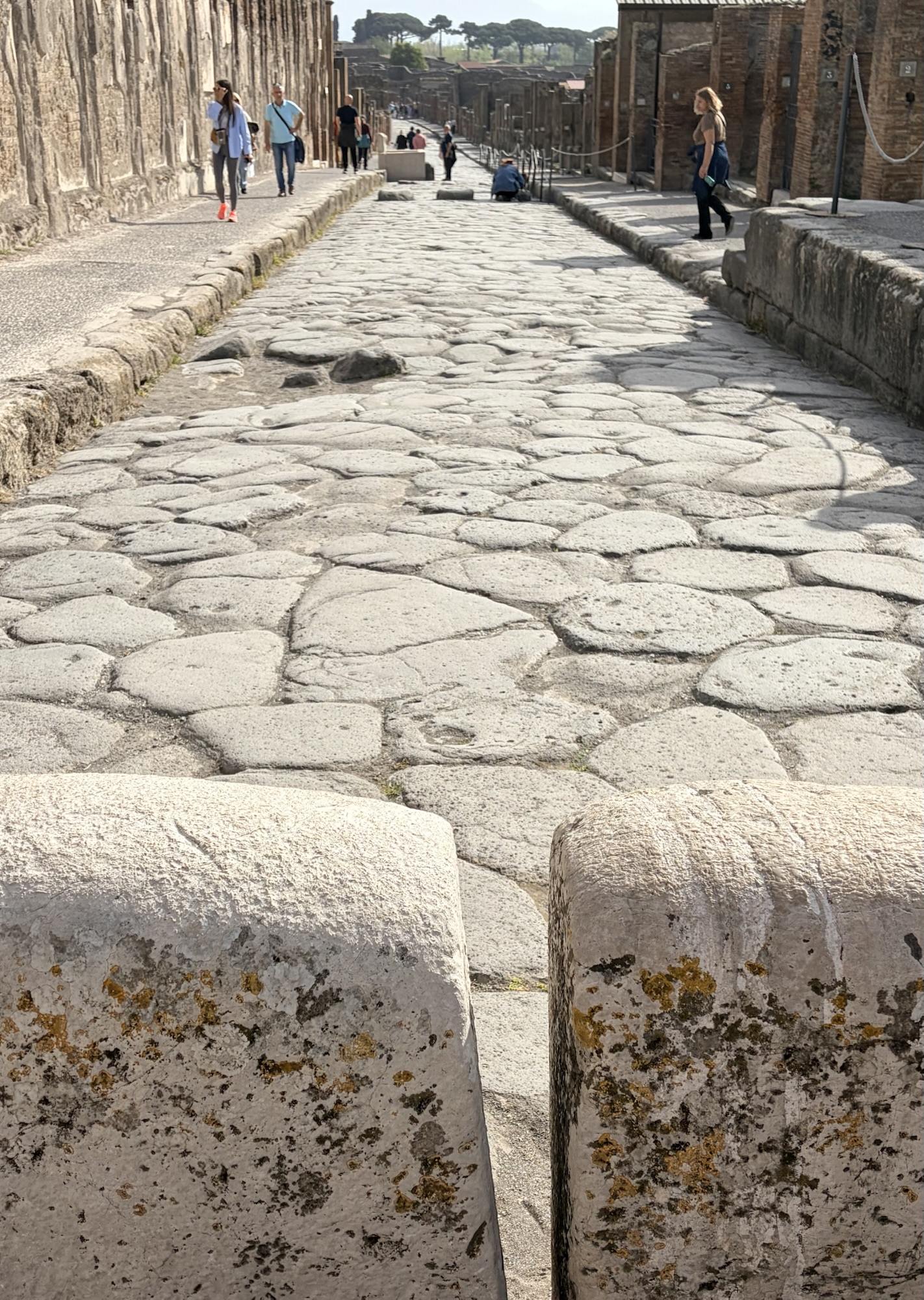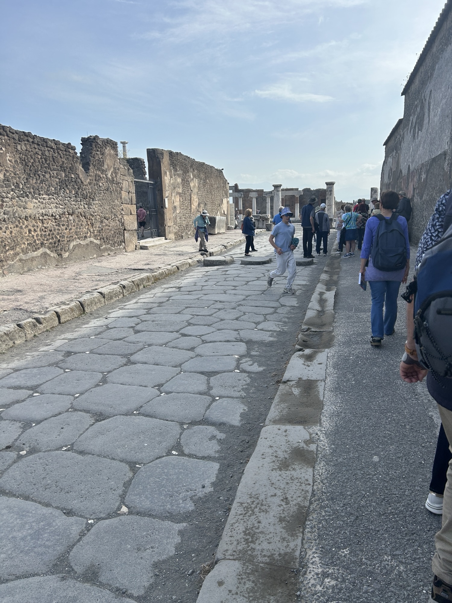 What was most remarkable to me is how much archeologists know about the life in Pompeii. An example is the identification of political life and even which houses politicians/officials lived in. If there’s a bench outside next to the entrance, it was there for clients of the official to sit waiting for an appointment. The purchase of votes was legal, so officials and aspiring officials provided favors or services in return for the client’s support. A particular house we were able to walk through (usually closed to the public but open occasionally to protect the interior frescoes) has what looks like a bench in front (a large rectangular stone) but archeologists know it was part of a street repair that had been moved out of the way. Speaking of which, the eruption was in 79AD, following a severe earthquake in 62AD. Repairs from the significant earthquake damage were still underway when Vesuvius erupted. Think of the wrangling over repairs and expenses, then boom.