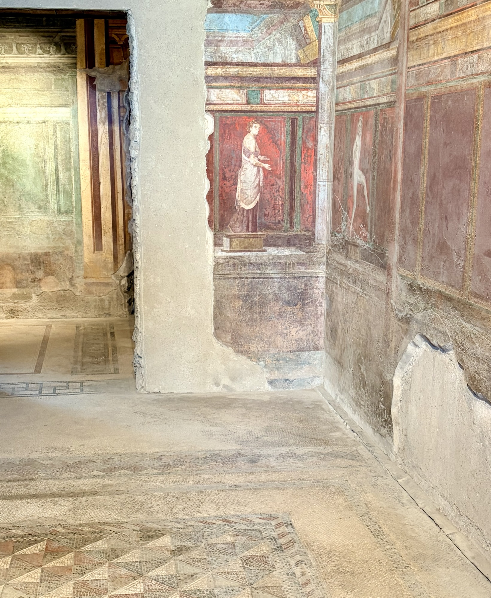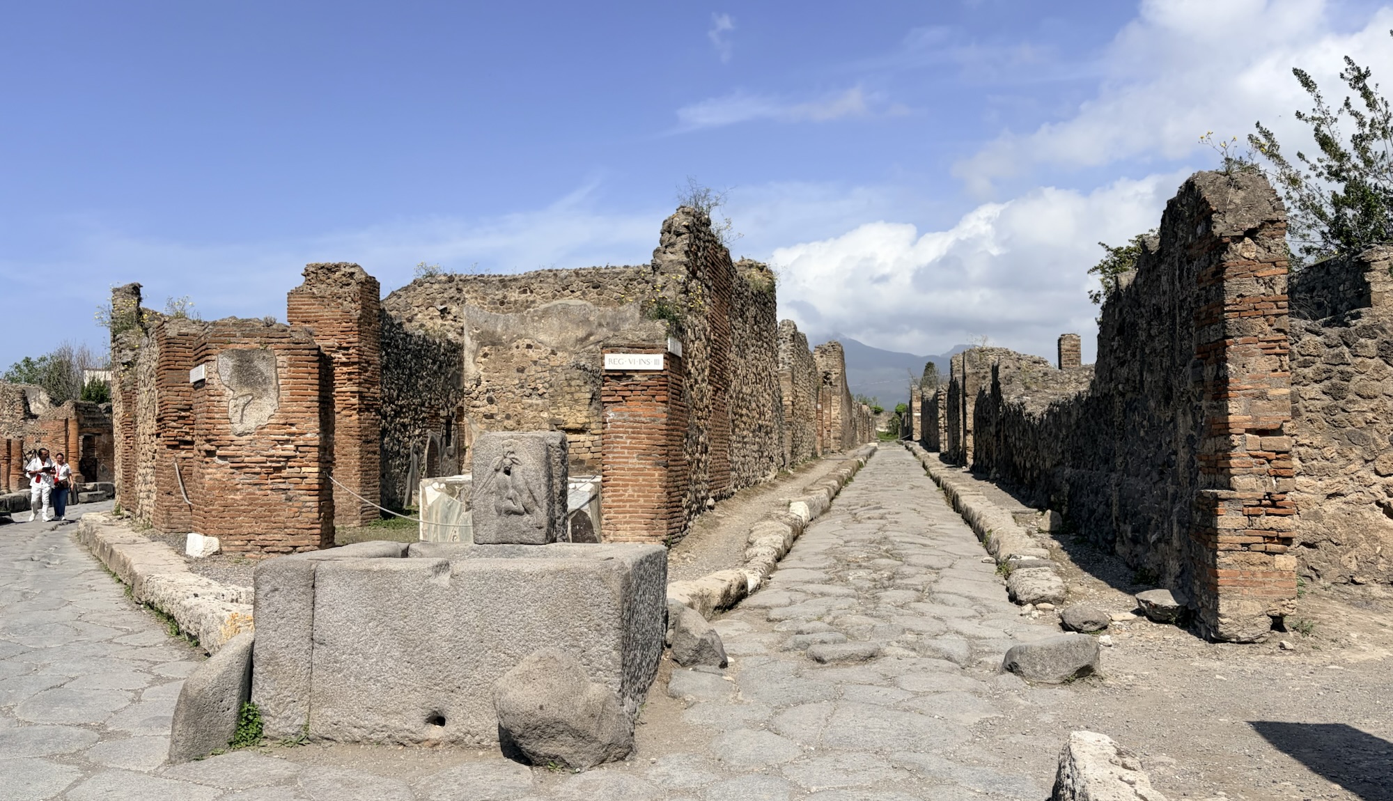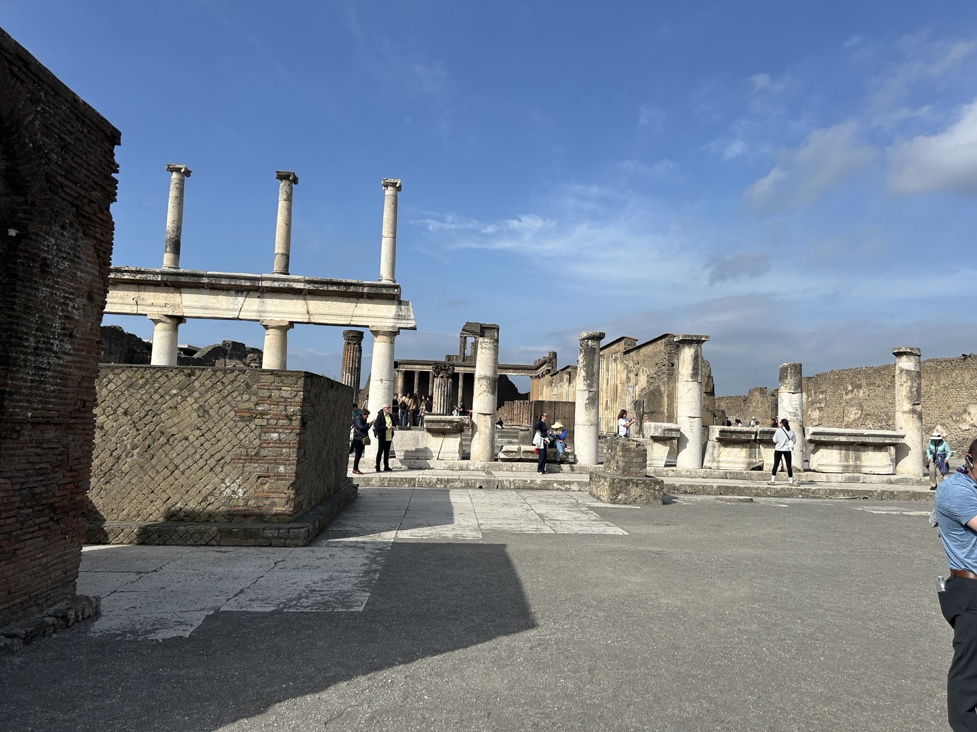 What was most remarkable to me is how much archeologists know about the life in Pompeii. An example is the identification of political life and even which houses politicians/officials lived in. If there’s a bench outside next to the entrance, it was there for clients of the official to sit waiting for an appointment. The purchase of votes was legal, so officials and aspiring officials provided favors or services in return for the client’s support. A particular house we were able to walk through (usually closed to the public but open occasionally to protect the interior frescoes) has what looks like a bench in front (a large rectangular stone) but archeologists know it was part of a street repair that had been moved out of the way. Speaking of which, the eruption was in 79AD, following a severe earthquake in 62AD. Repairs from the significant earthquake damage were still underway when Vesuvius erupted. Think of the wrangling over repairs and expenses, then boom.