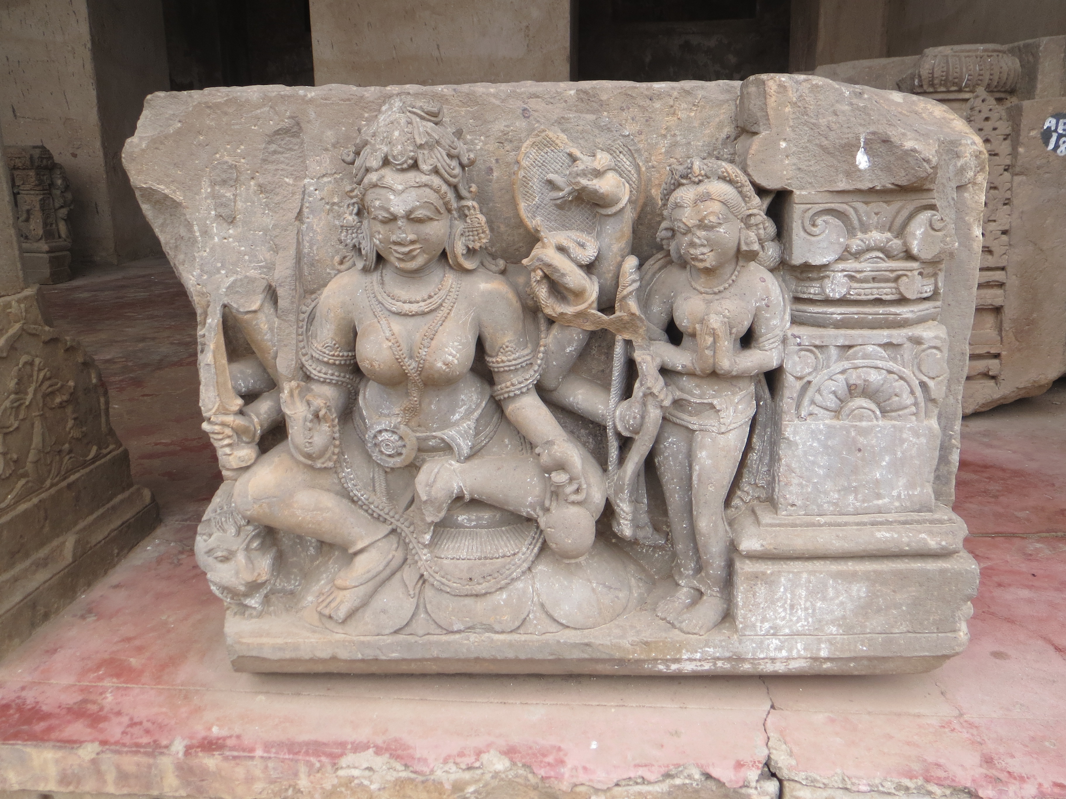 After a couple of hours we turned off the highway and headed a few miles down the side road, coming to what appeared to be a tiny village, though our guide told us several thousand live there. Our van stopped and there right on the road was an informational sign for Chand Baori, Abaneri, one of the oldest step wells in Rajasthan and built in the 8th or 9th century. Inside the low entry and down a few steps is a living Hindu temple to Hanuman, the monkey god; the entire temple is perhaps 10 feet long, though clearly in use. And the step well–how to describe it? Twenty meters deep (about 6 stories) surrounded by an elaborate series of steps on all sides, and a colonnade on 3 sides where pieces of carved parapets have been numbered and lined up for restoration.