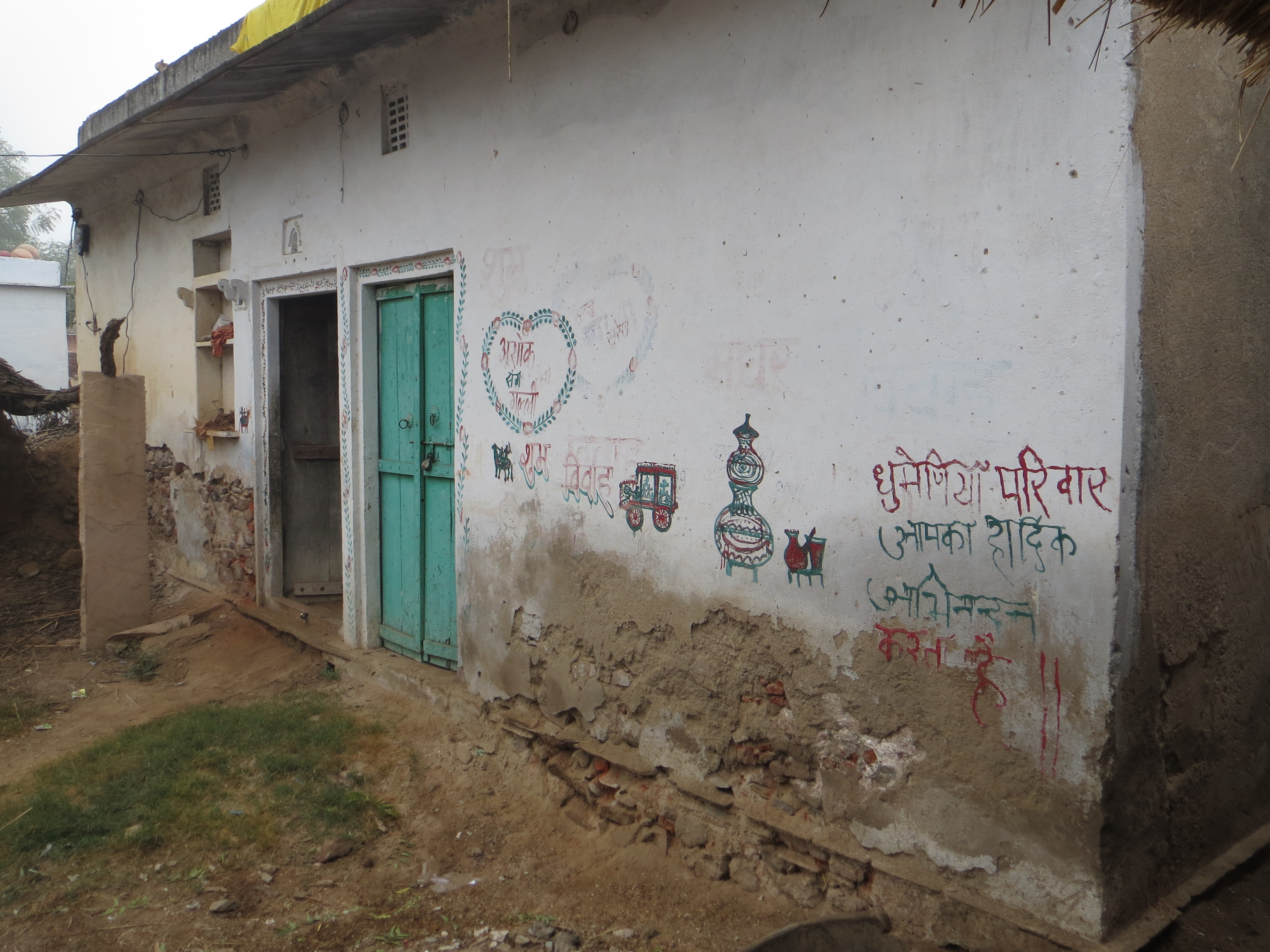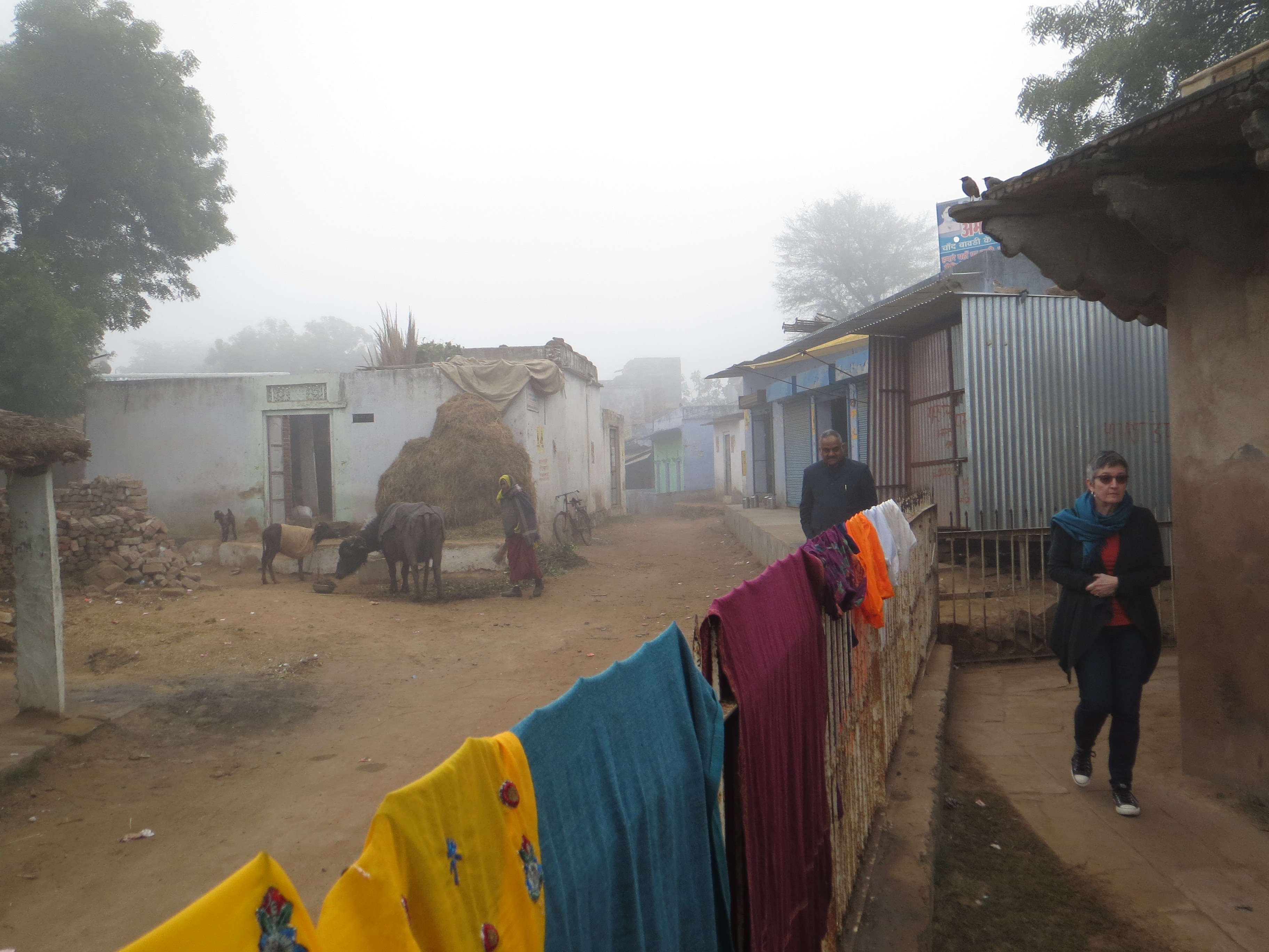 We set out on a cold and foggy morning, leaving the bustle of Jaipur for the open road to Agra, on which we saw–and often very narrowly missed colliding with–cars, buses, tourist vans, horse-drawn carts, donkey-drawn carts, camel-drawn carts, tractors, bicycles, motorcycles, goods carriers (commercial trucks) of various sizes, all brightly painted, 3-wheel taxis (motorized), 3-wheel taxis (cycles). Bicycling men coming toward us in white turbans, grey blankets, and cloth-wrapped faces against the cold. A blast of artificial sunshine as a woman in a saffron-gold sari disappeared down a cross road into the fog. Long-haul trucks with open trailers, one painted with a lake scene and stylized flowers, all with artificial flowers stuck in the outside mirrors and long green tassels swinging from side windows, painted of course with instructions to BLOW HORN or HORN PLEASE. (The honking is incessant, as apparently every driver must honk when passing, almost passing, or having just passed another vehicle of any kind.) Trotting dogs, ears alert, and sleeping dogs curled up, playful dogs wrestling. Two-toned crows with thick beaks. Dangling strings of colorful packets of beetlenuts from every khoka (small commercial stand). Red resin chairs in tight circles around small fires where men in turbans and blankets huddle in conversation. Standing women in saris of every color, also in tight circles. Sweepers, mostly women, bent over at work in saris of every bright color. A young man in trunks, nothing else, washing his hair at a large caldron of water. Small conical Hindu temples. Silhouetted trees in the bright fog.
