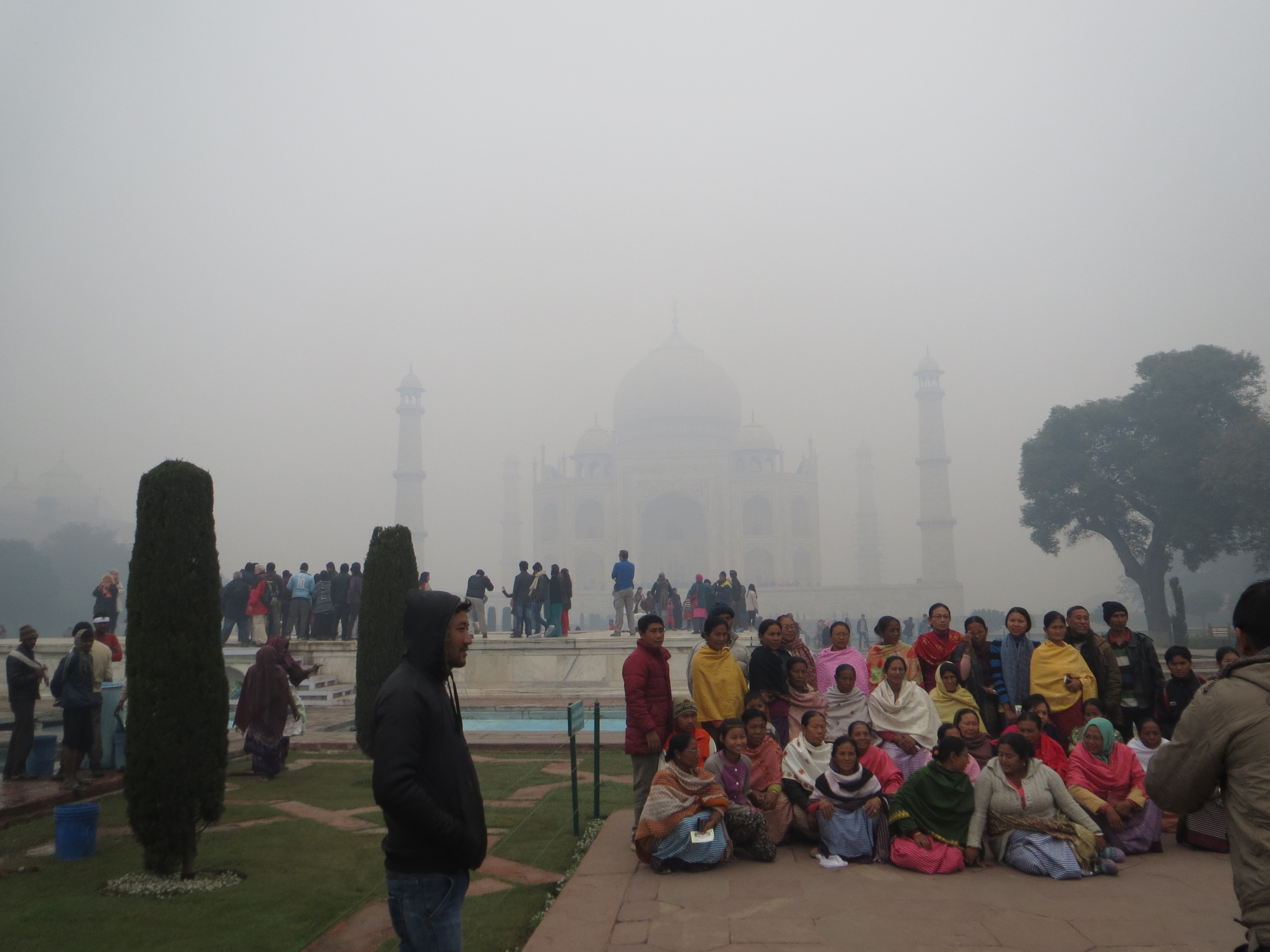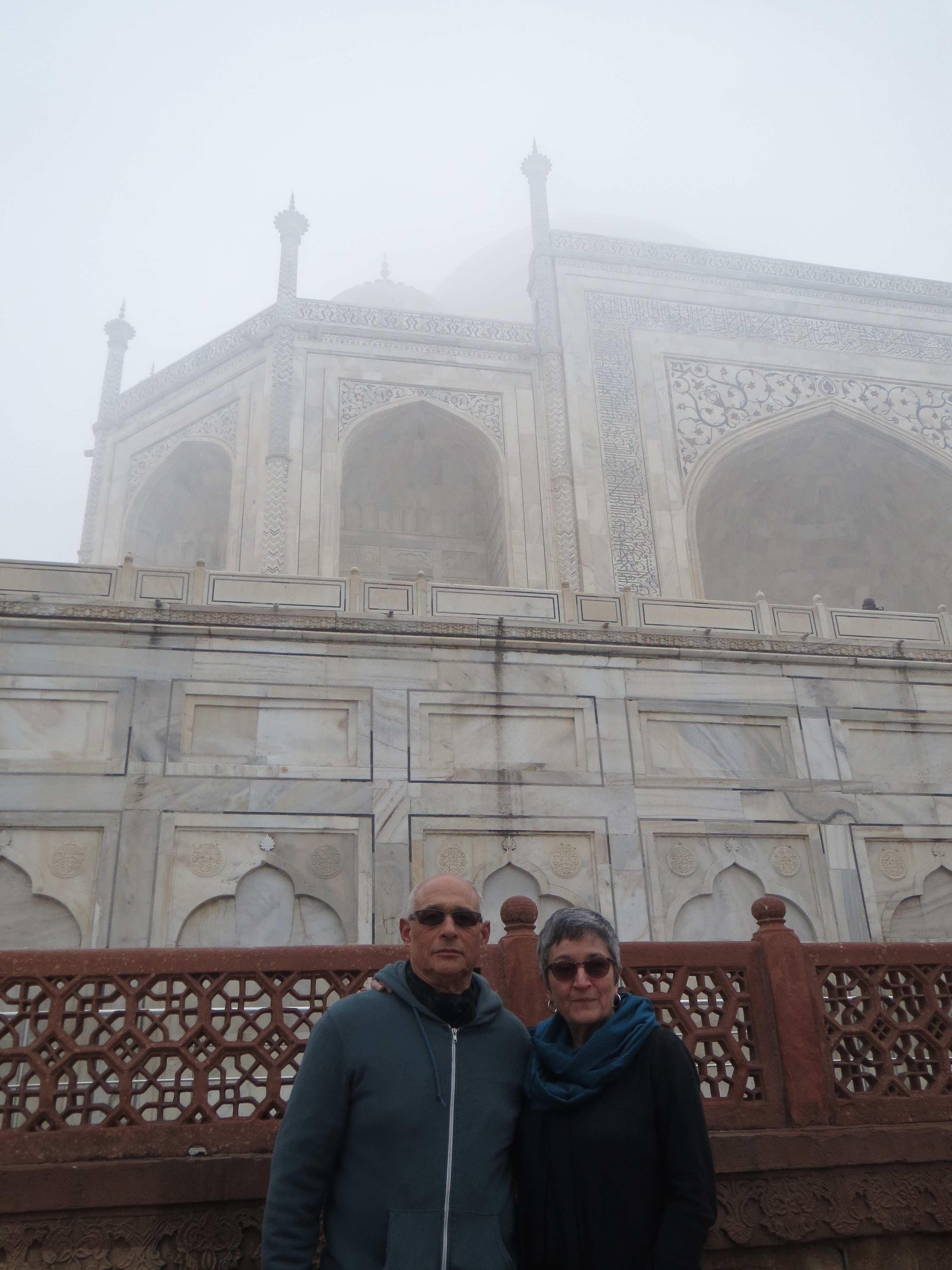 The fog seemed to be thinning a bit as we drove to the Taj. One lovely thing about Agra–the hotel, Taj, fort, all within 5-10 minutes of each other. SO different from Delhi.