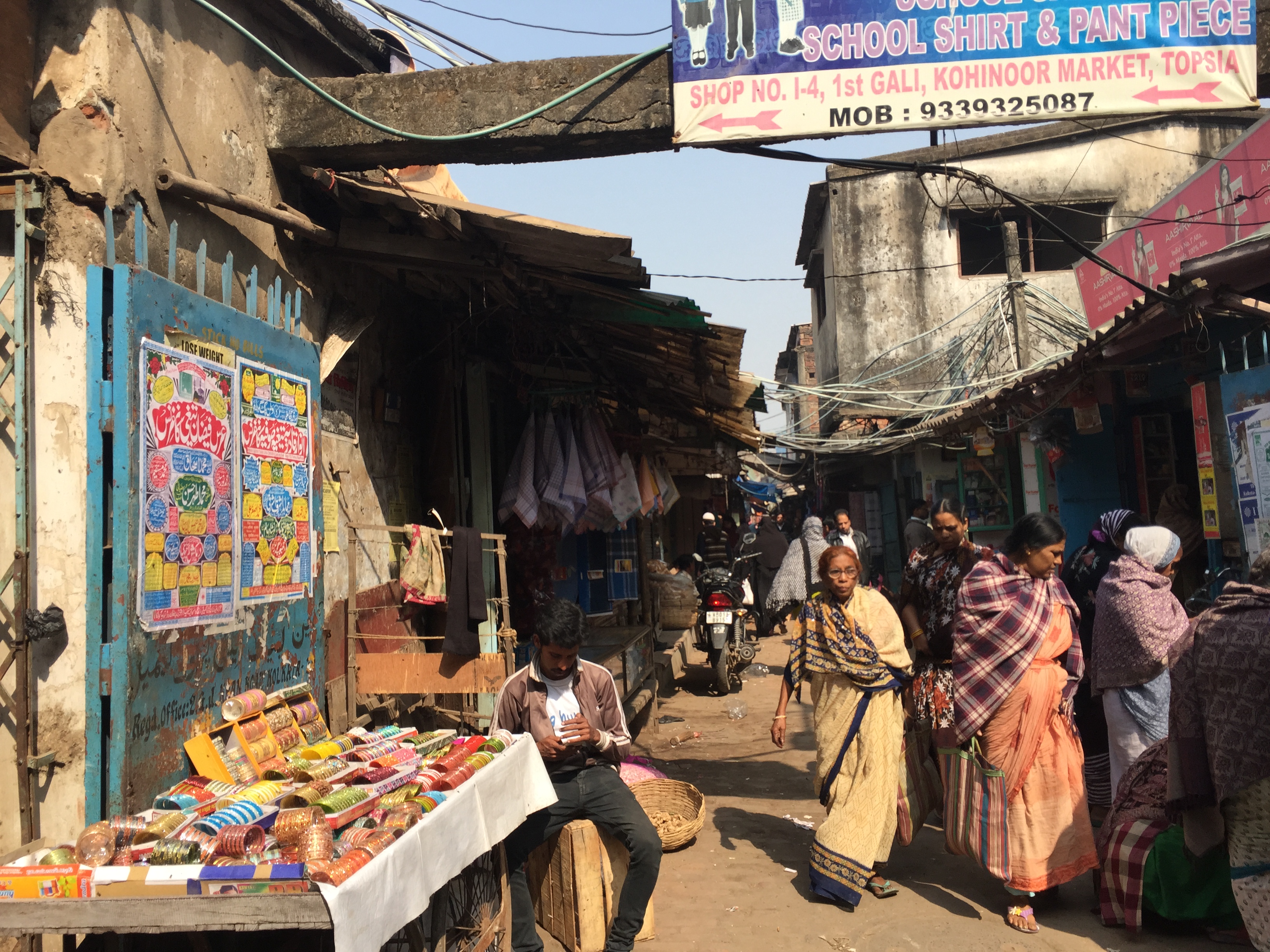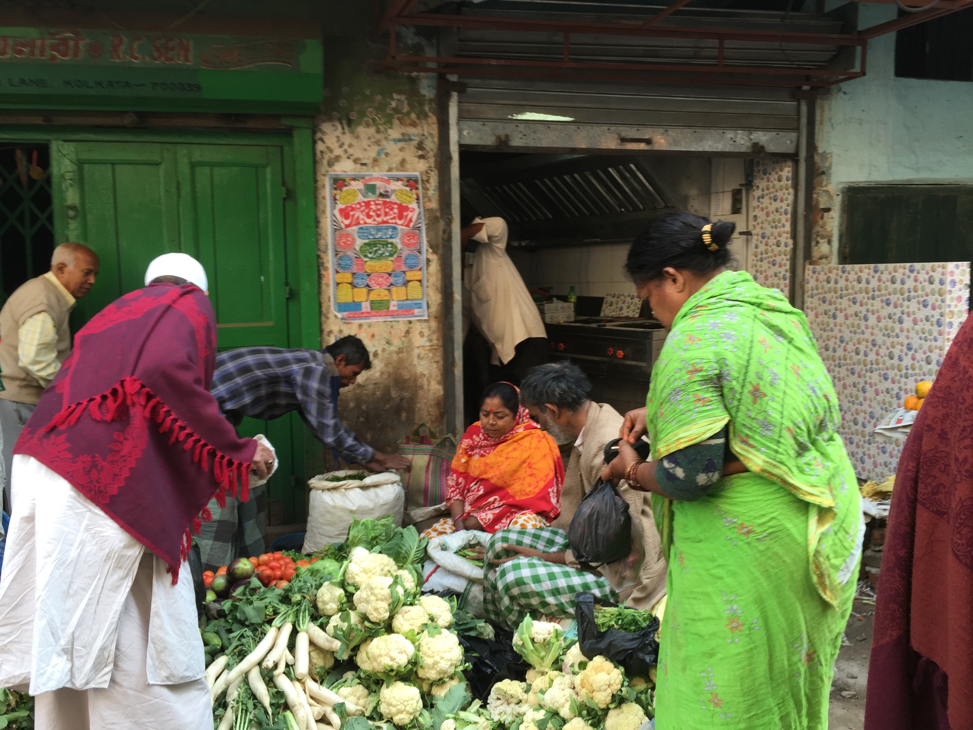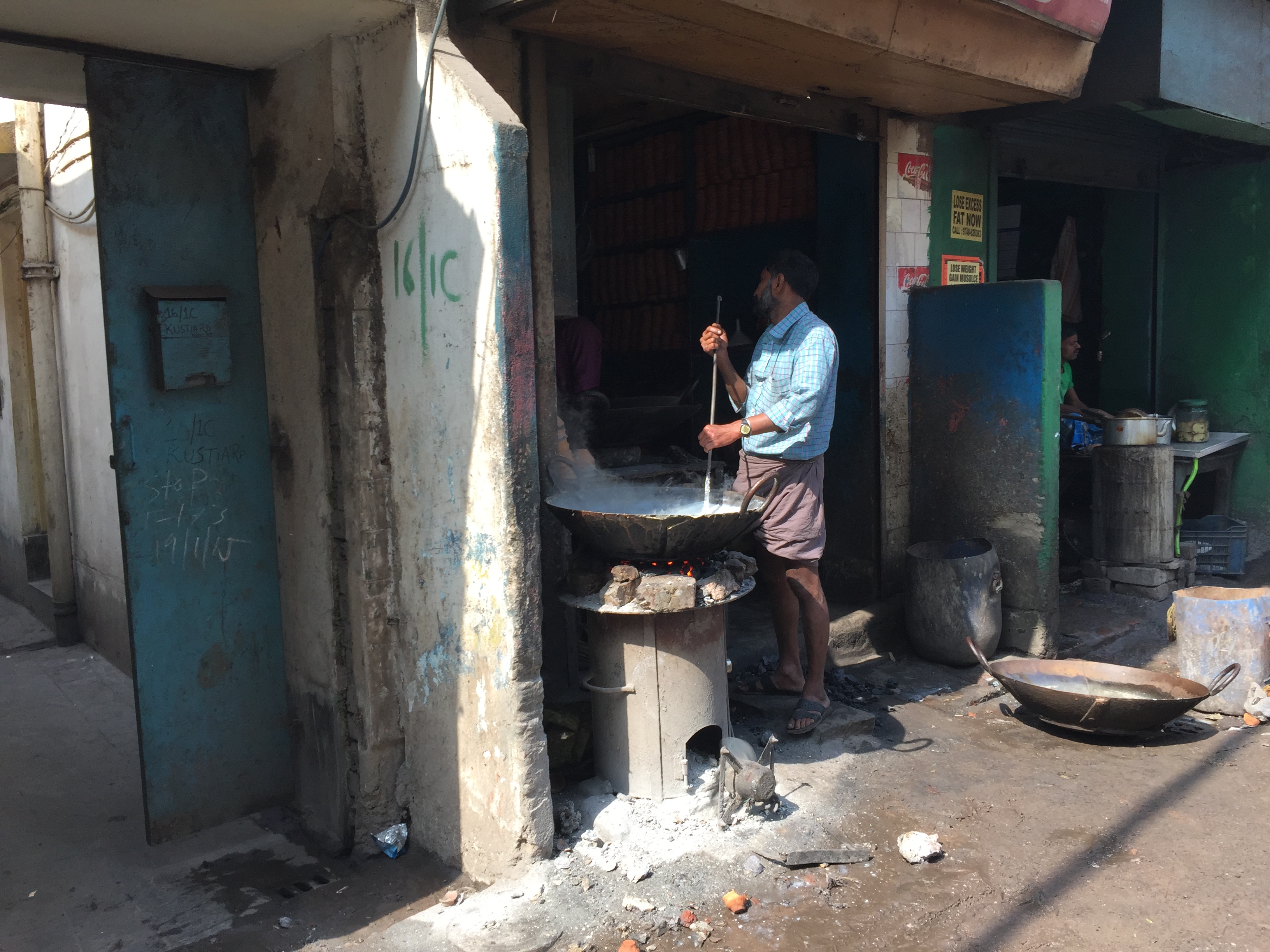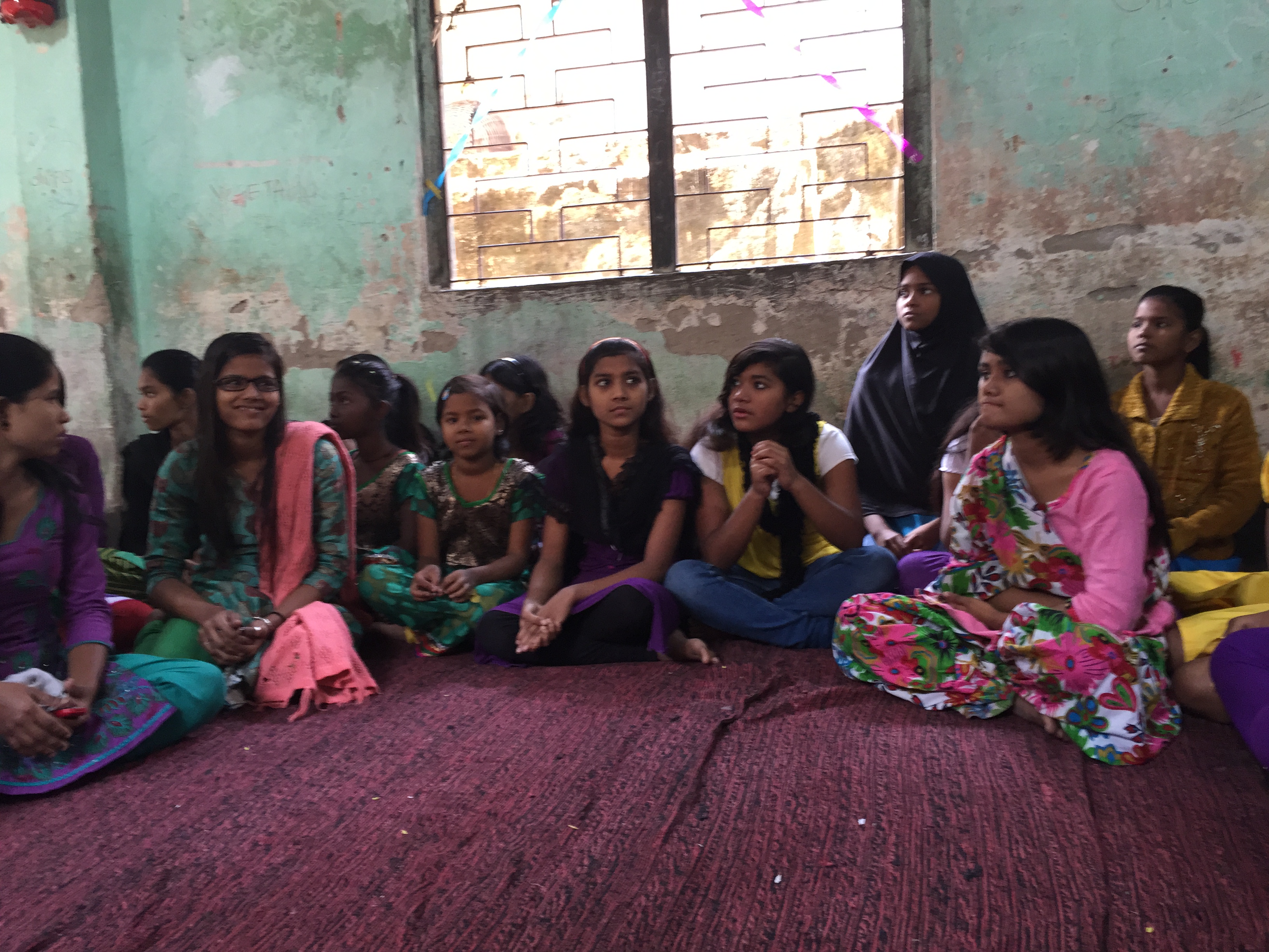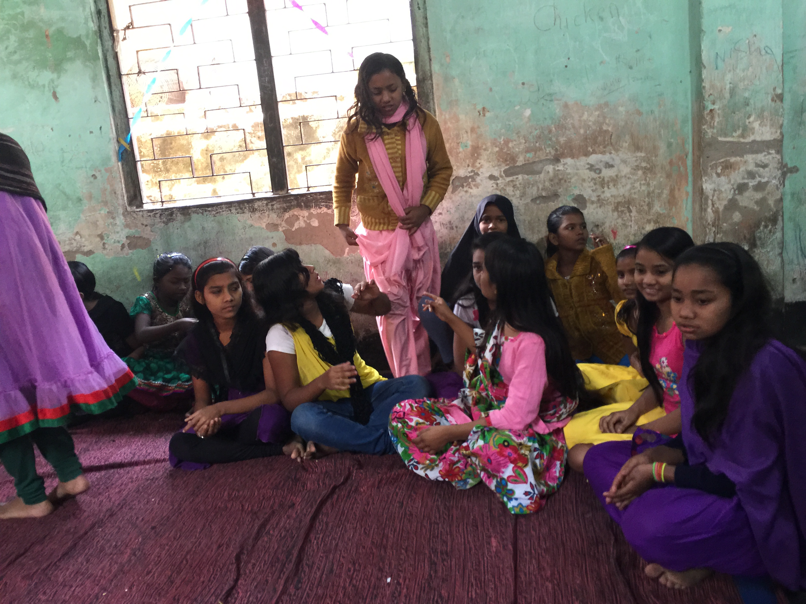 We set out in multiple minivans, intending to caravan to the government day care site where we would meet a group of adolescent girls who are learning hygiene and nutrition through games, drama, and peer-to-peer training. Our CEO Steve tells us this is a lower working class neighborhood, a labyrinth of extremely narrow, twisting streets, teeming with commercial activities of every kind. Small stores selling sundries, barbers, copying and scanning shops, butchers, cooked milk products, sweet shops, kids in school, women dressed in the gamut of Indian and Muslim dress, men on motorcycles, rickshaws, cars, garbage heaps, knife sharpeners, dogs and goats, and and and! Our driver quickly lost the lead car and his way, and, incredibly, we ended up backing out of these twisting, narrow “streets” once, twice, three times, with various cell phone arguments as he tried to figure out where to go. We passed Laxmi Sweets 3 times, and in this maze when you are able to recognize you have been here before you know you are good and lost.