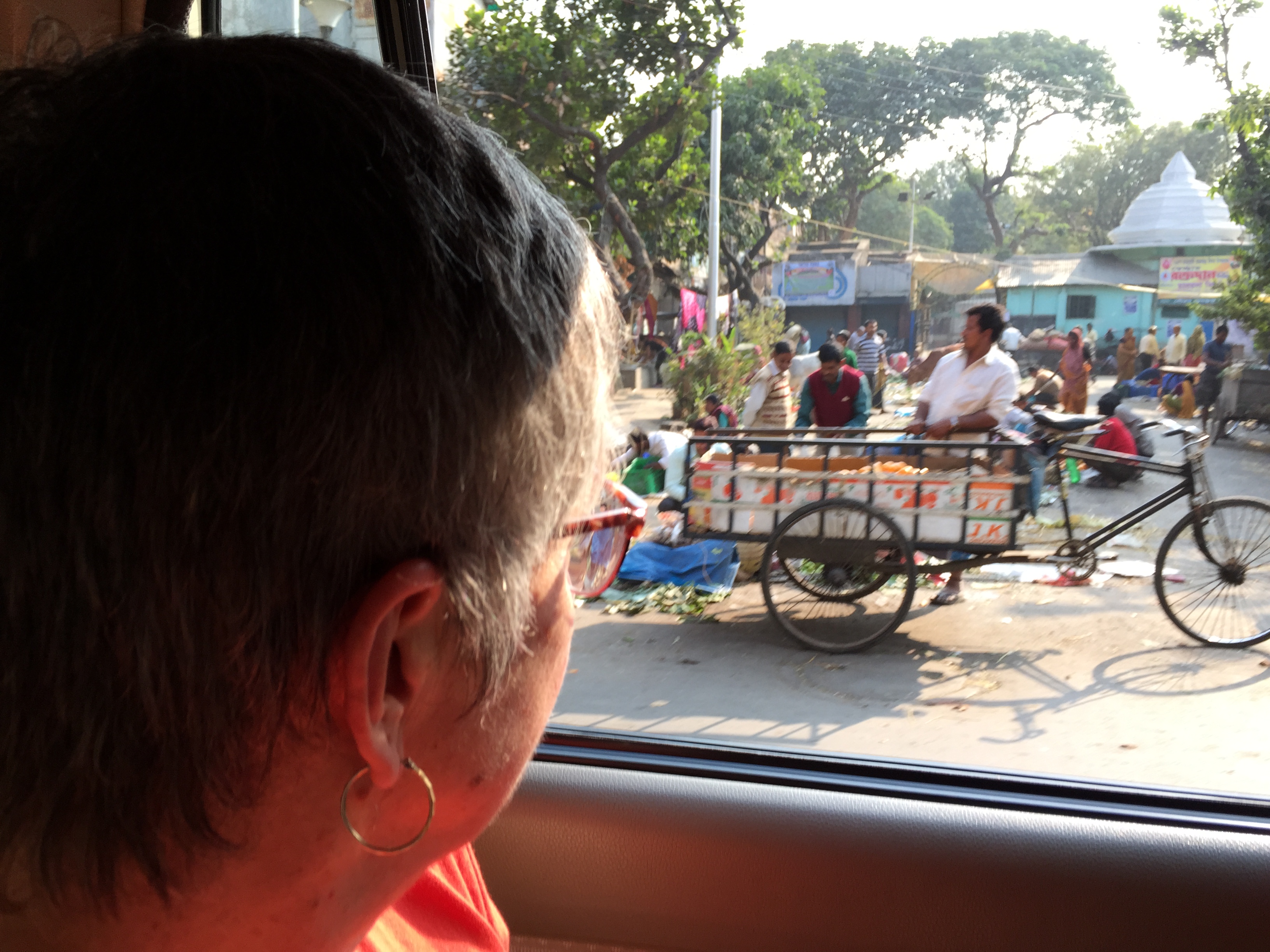 Our hosts are both educated and work as guides themselves. When we arrived, Mr. Napan (I have to check this–we weren’t taking notes!) asked where we were from, and when I said California he immediately asked “Habla espanol?” Turns out this is his primary “guide” language, in addition to of course Hindi, English and Bangla. We had a lovely visit, served fresh orange juice to start, and then went into the kitchen to watch lunch being prepared. It was delicious, and, of course, way too much food. A chicken and potato dish, made with a paste of ginger, onion, and garlic; cauliflower prepared with salt, sugar (to help it brown), and cumin seed, as well as carmelized onion, garlic, and ginger; a simple yellow lentil dal, fish cooked in mustard with cilantro, and rice. And of course homemade paneer sweets (sweetened with the juice of something we asked several times to repeat but never got it). Stuffed. She cooks in a tiny kitchen, moving between an electric hot plate for frying and browning, a 3 burner gas “stove” that sits on the counter, and a microwave.