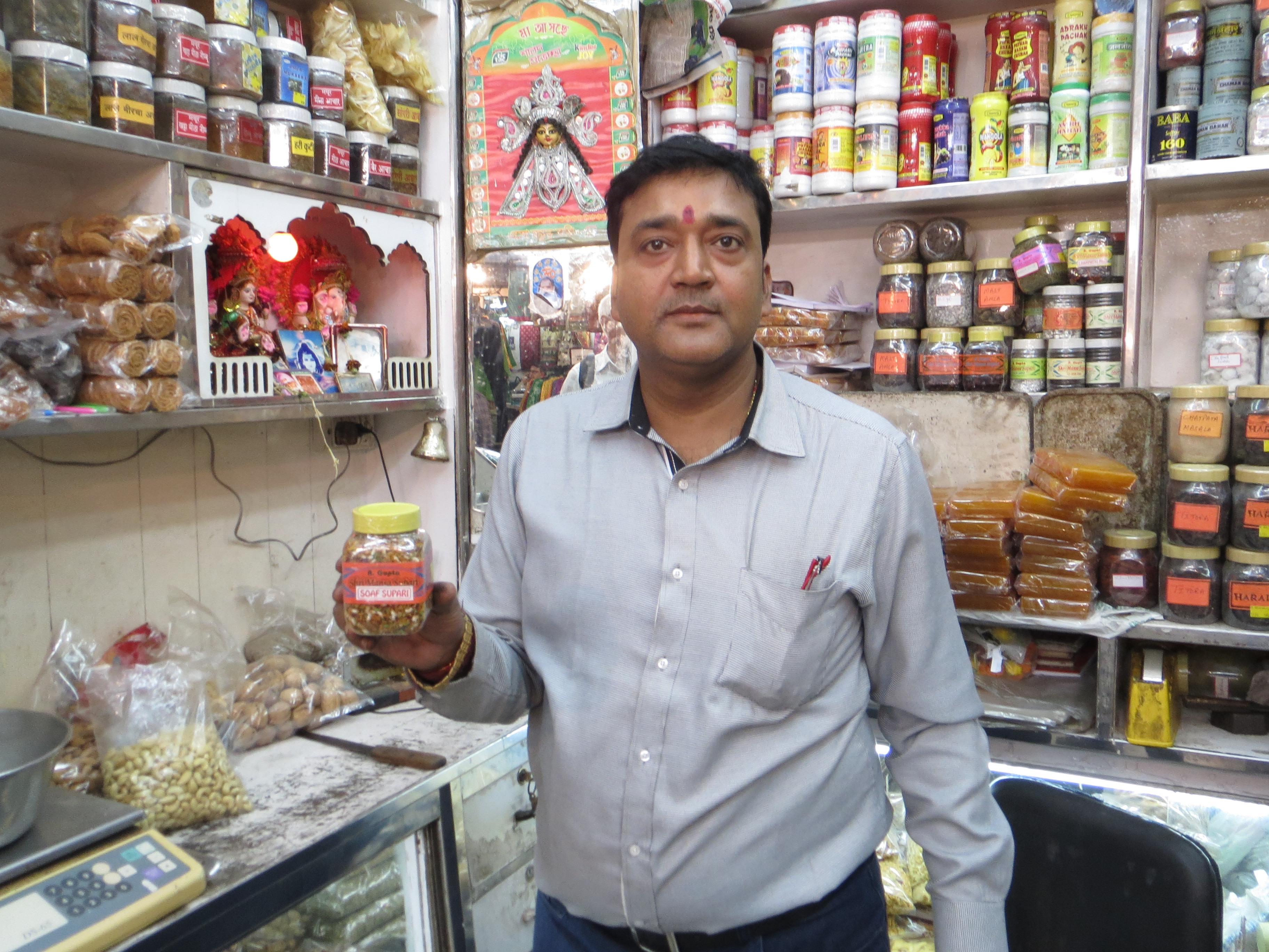 We also spotted, as soon as we entered, a store selling packaged snacks (chips and things) as well as various spices, where we picked up some saffron. But what attracted me to the store were several shelves of various types of the little breath-freshener anise seed mixtures you see in a dish at the register of an Indian restaurant both here and in the US. I had hoped to find something similar to the delicious mix we had at Pindi in Delhi, and I did.