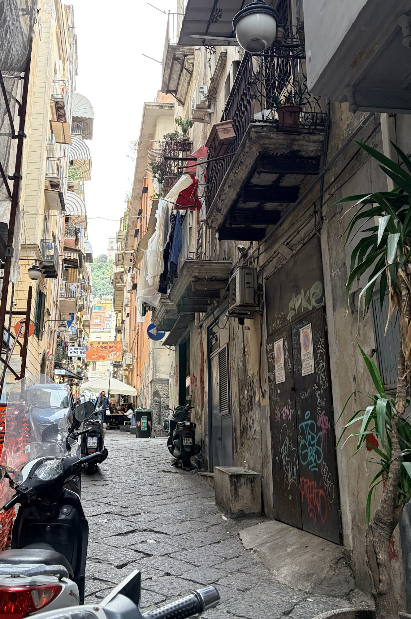 We are staying in the recommended Spanish Quarter, the old part of the city, on Via Toledo, a major commercial street that is a pretty constant roar of traffic and motorcycles, honking and beeping as pedestrians weave through intersections while motorcycles and cars weave around them. It is semi-organized bedlam. The sidewalks are especially uneven as are the streets, so walking you must look down and around you at the same time. It’s rather exciting once you get the hang of it. We saw no crashes, no fallen pedestrians, so it all seems to work. Courage required, however.