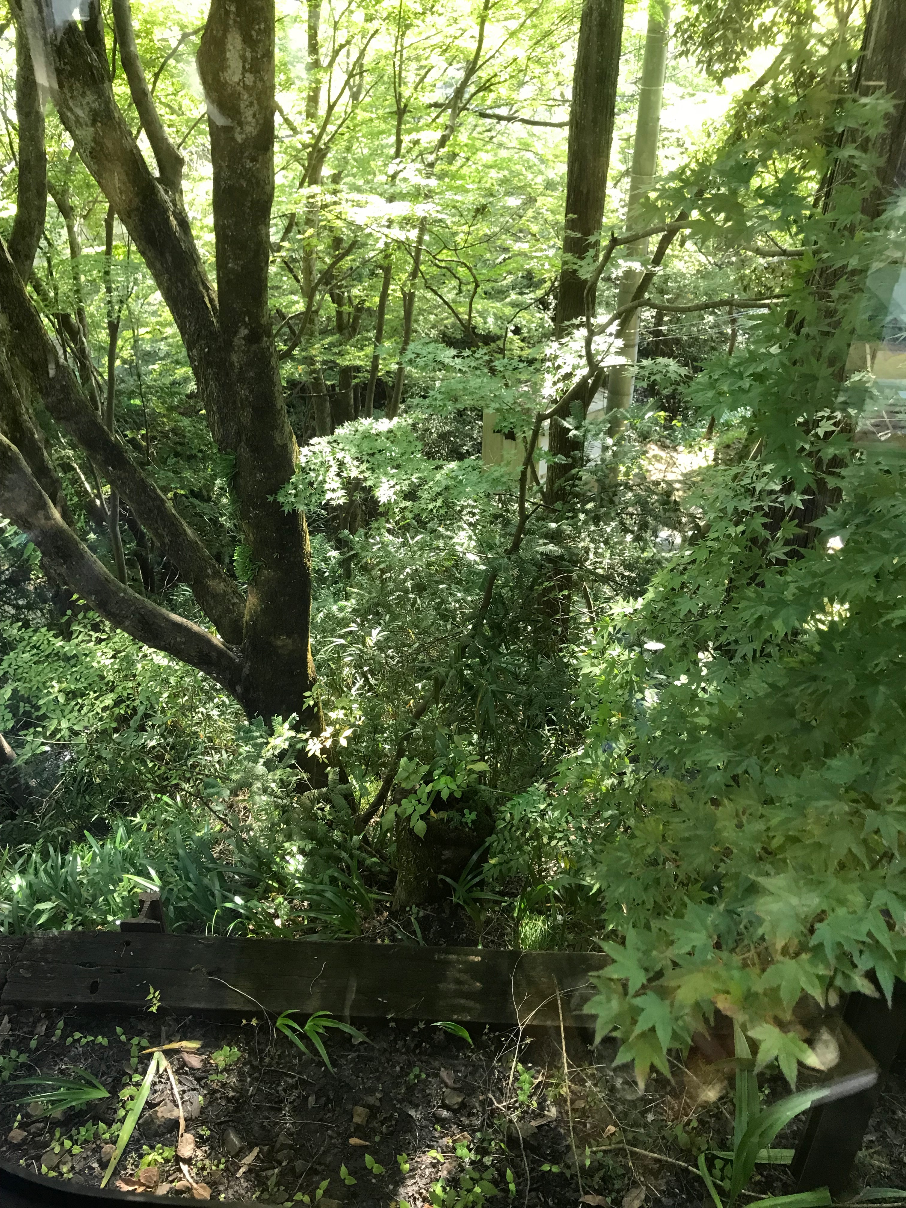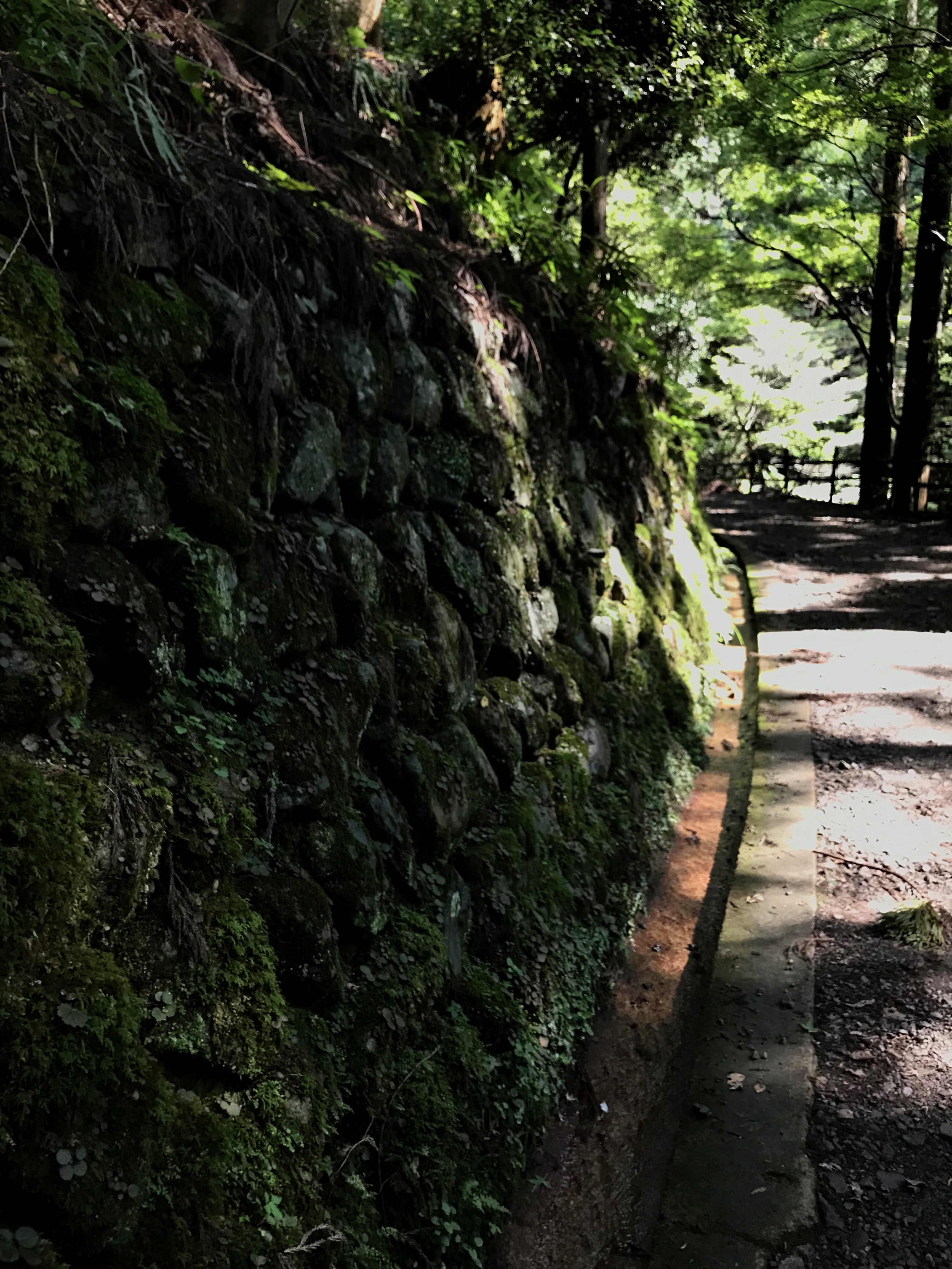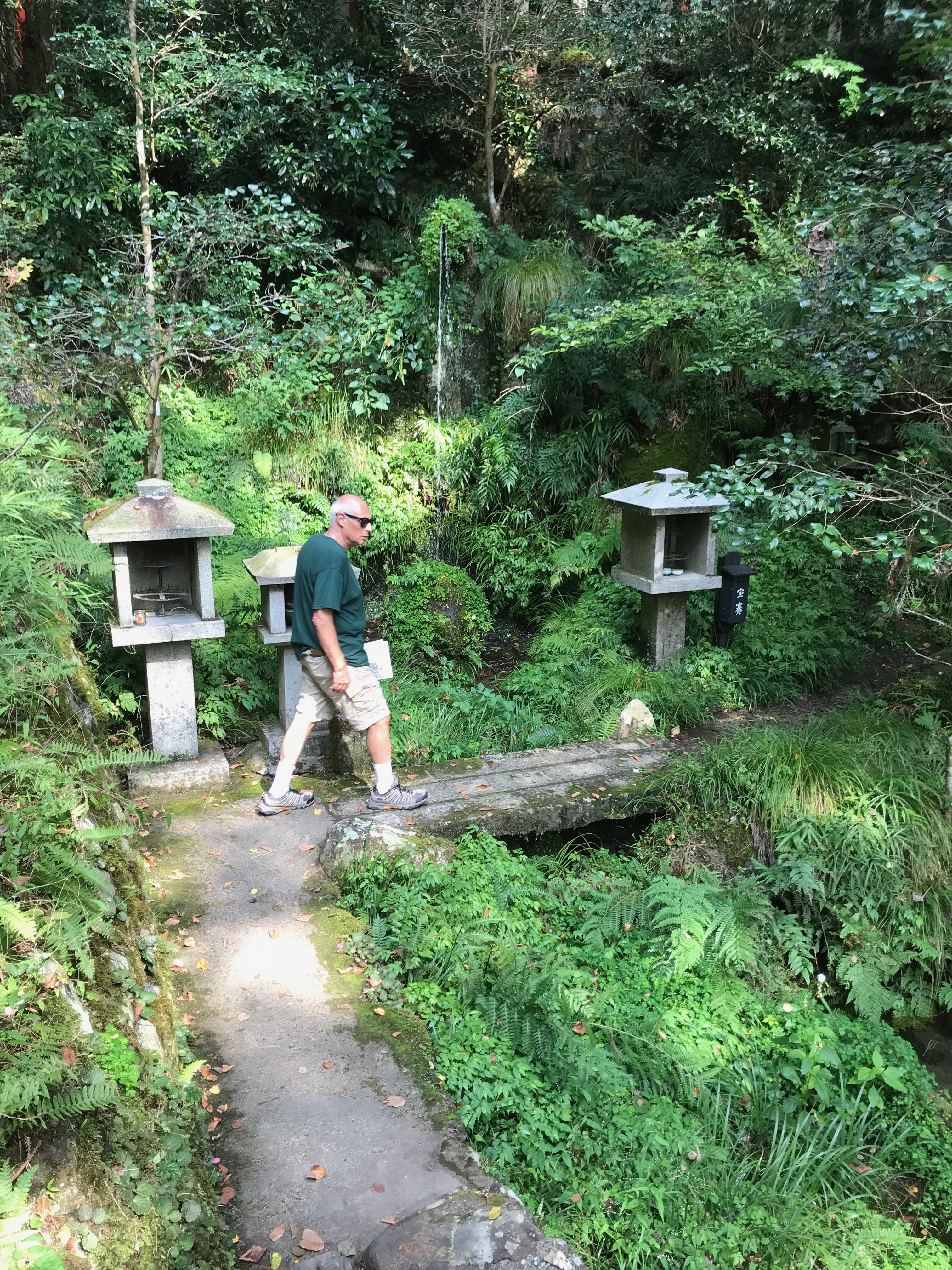 The route is not only lovely as mountain forest, but every 10 minutes or so you come across another temple. Some tiny, a few pretty big (big for the setting but not by Kyoto city standards). We were not totally alone on the trail–this is a popular day trip–and 90% of the people we saw were Japanese. It is not an easy climb in places–the stone steps as you get higher are obviously old and the dirt between them worn away–and in other places it’s similar to hiking in a northern California forest with slightly different trees. After maybe two hours we reached the summit, hurrah, and started down on the other side where it was quite a bit steeper and more unrelenting a climb.