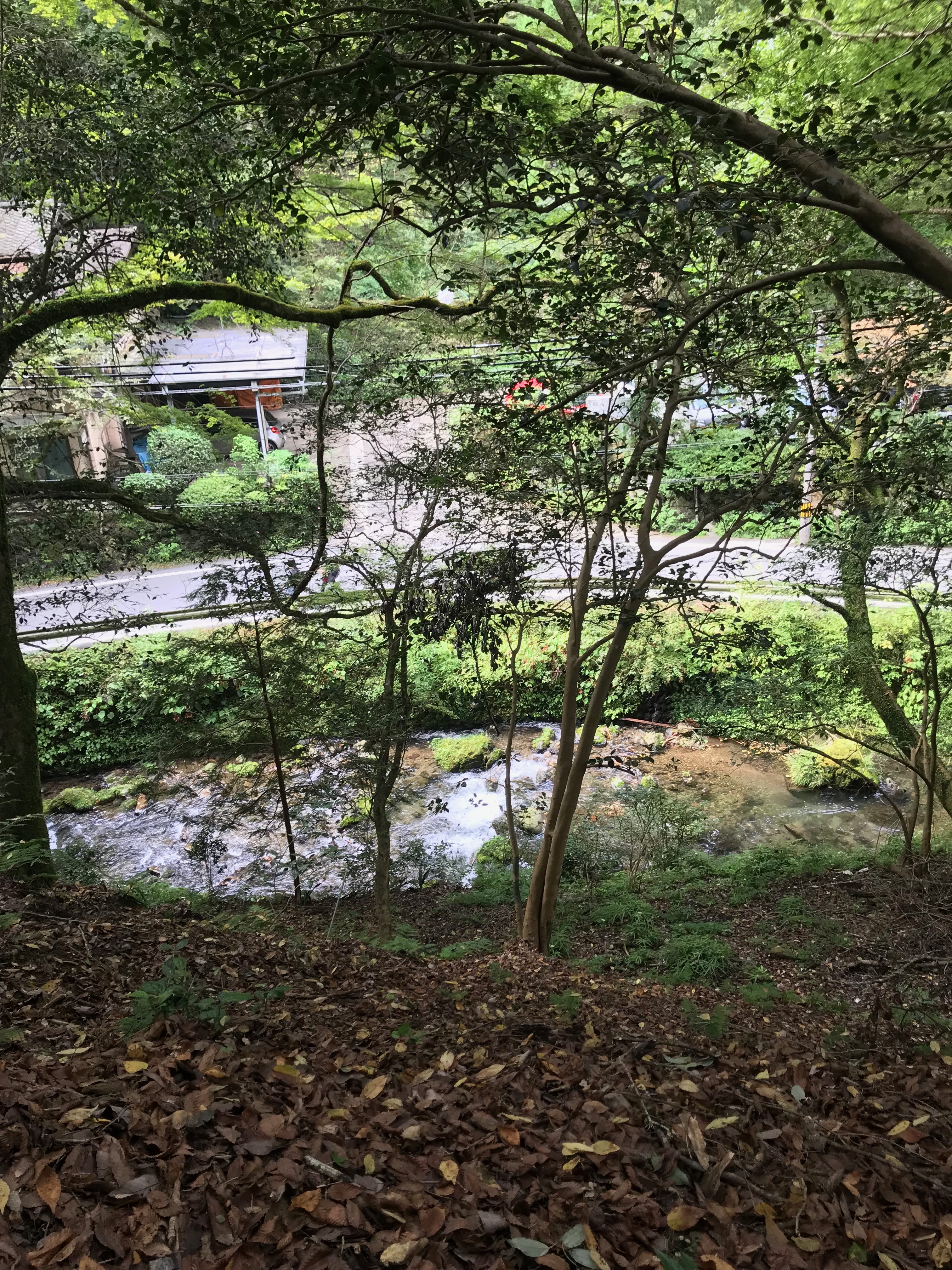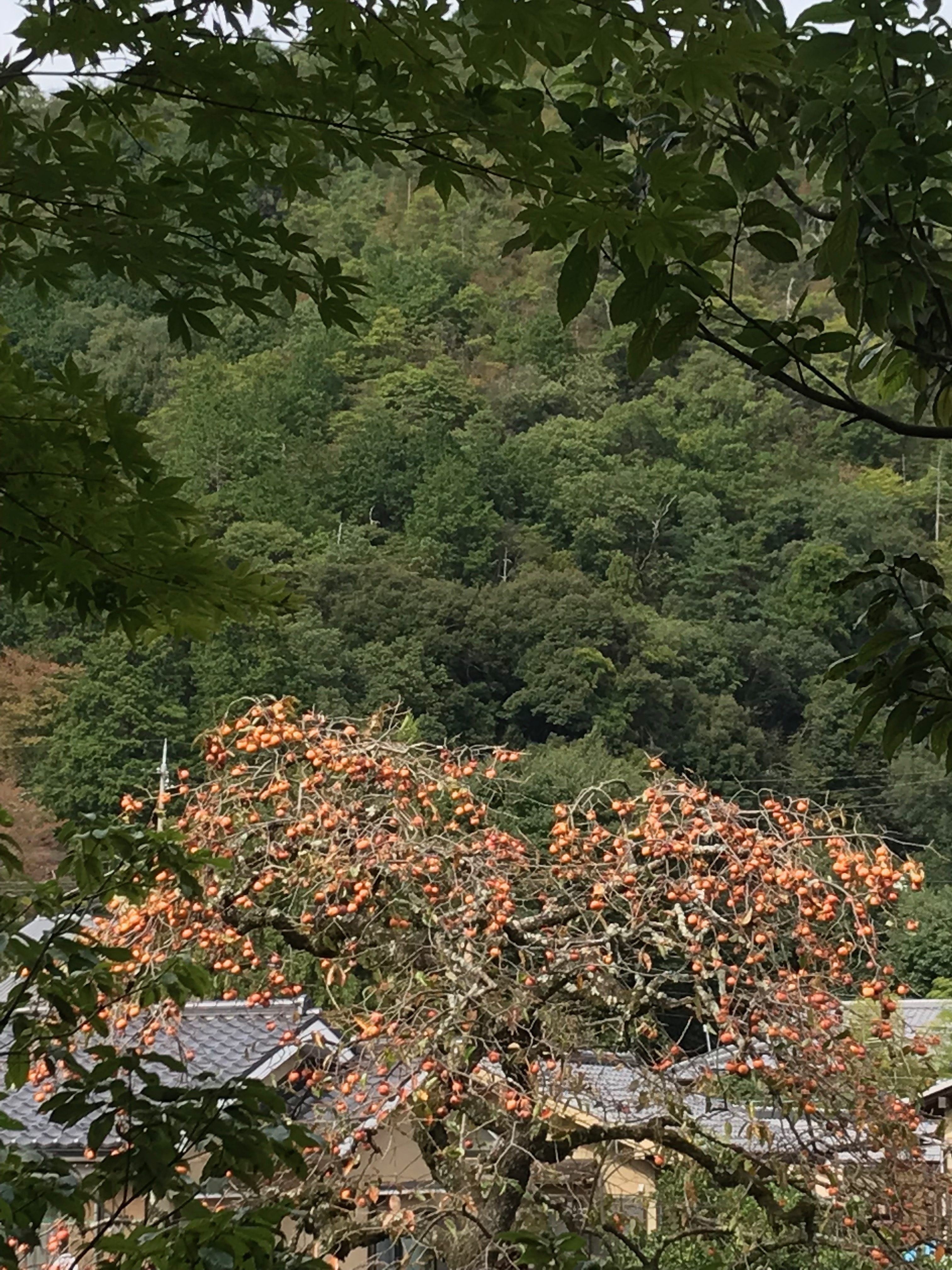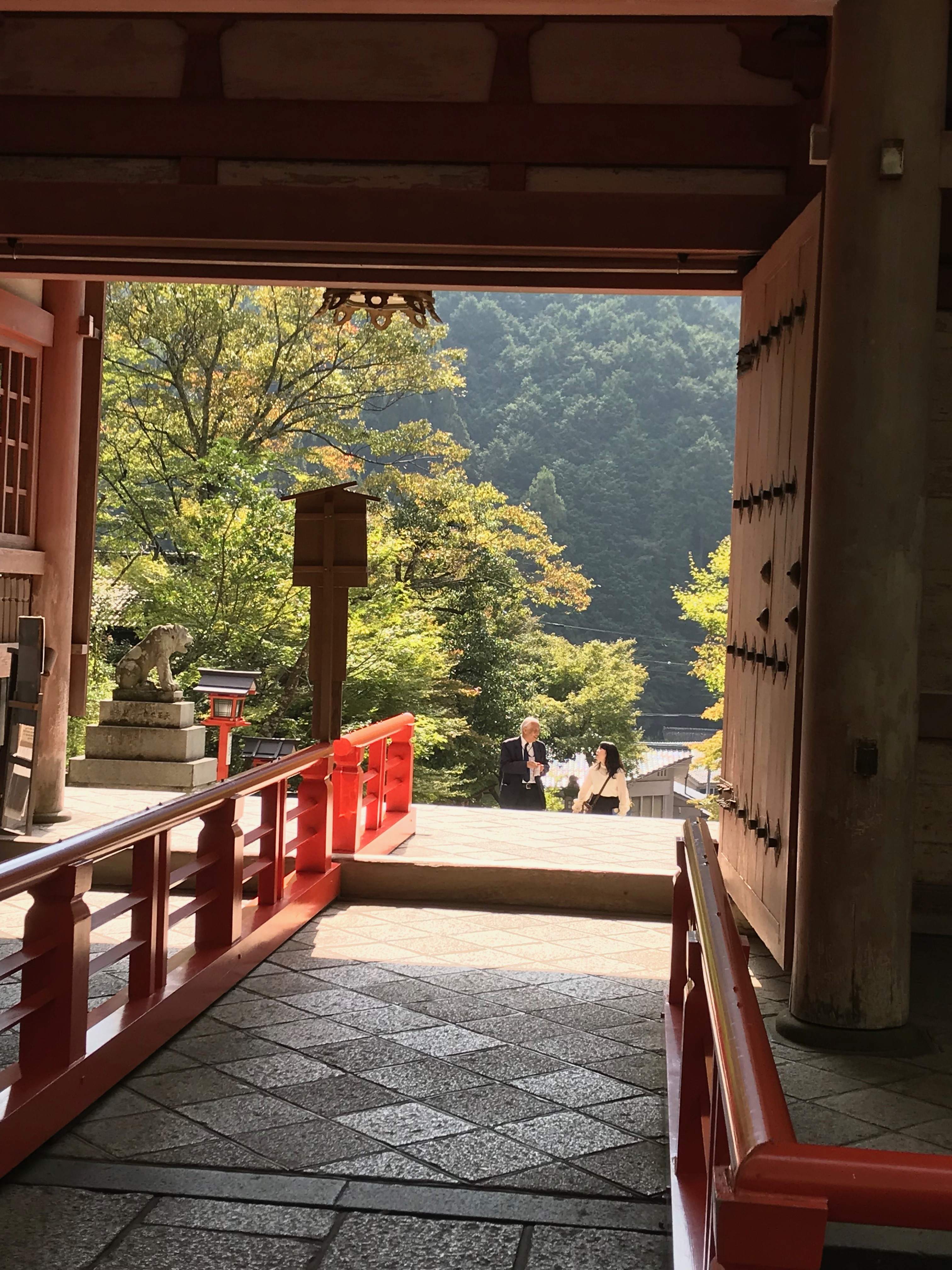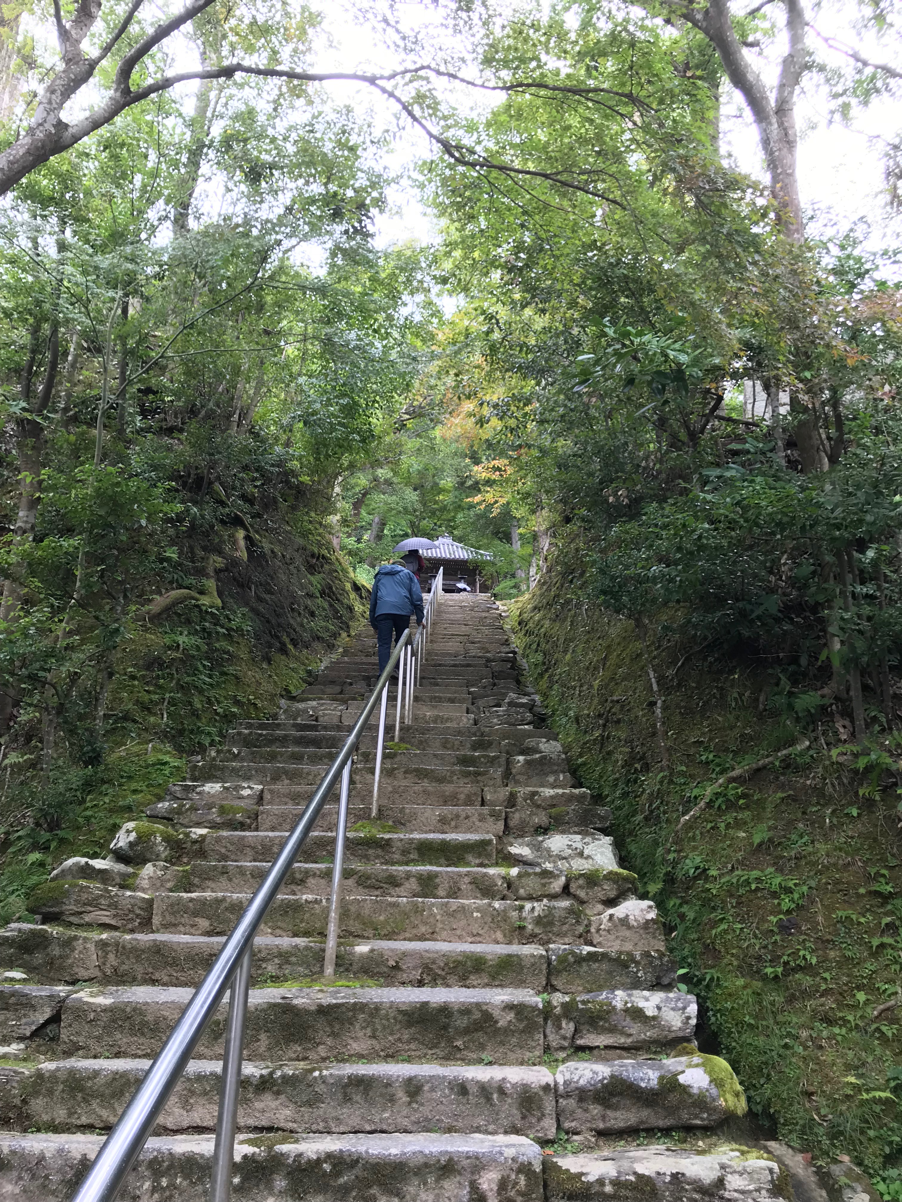 You hop on one of the subway lines and take it (north) to the end; go upstairs and get on the electric trolley/train (the line starts at that station) and off you go into the suburbs of Kyoto. Very lovely, quiet, scenic, and within 15 minutes you are surrounded by trees brushing up against the windows on both sides and into the mountains. You get off at the last stop and are in a tiny village–you and the other 8 or so passengers who are clearly there daytripping, walk up the hill and in a minute you are climbing into a temple, large for the scale of the town, and in front of you are steps and paths winding into the forest.