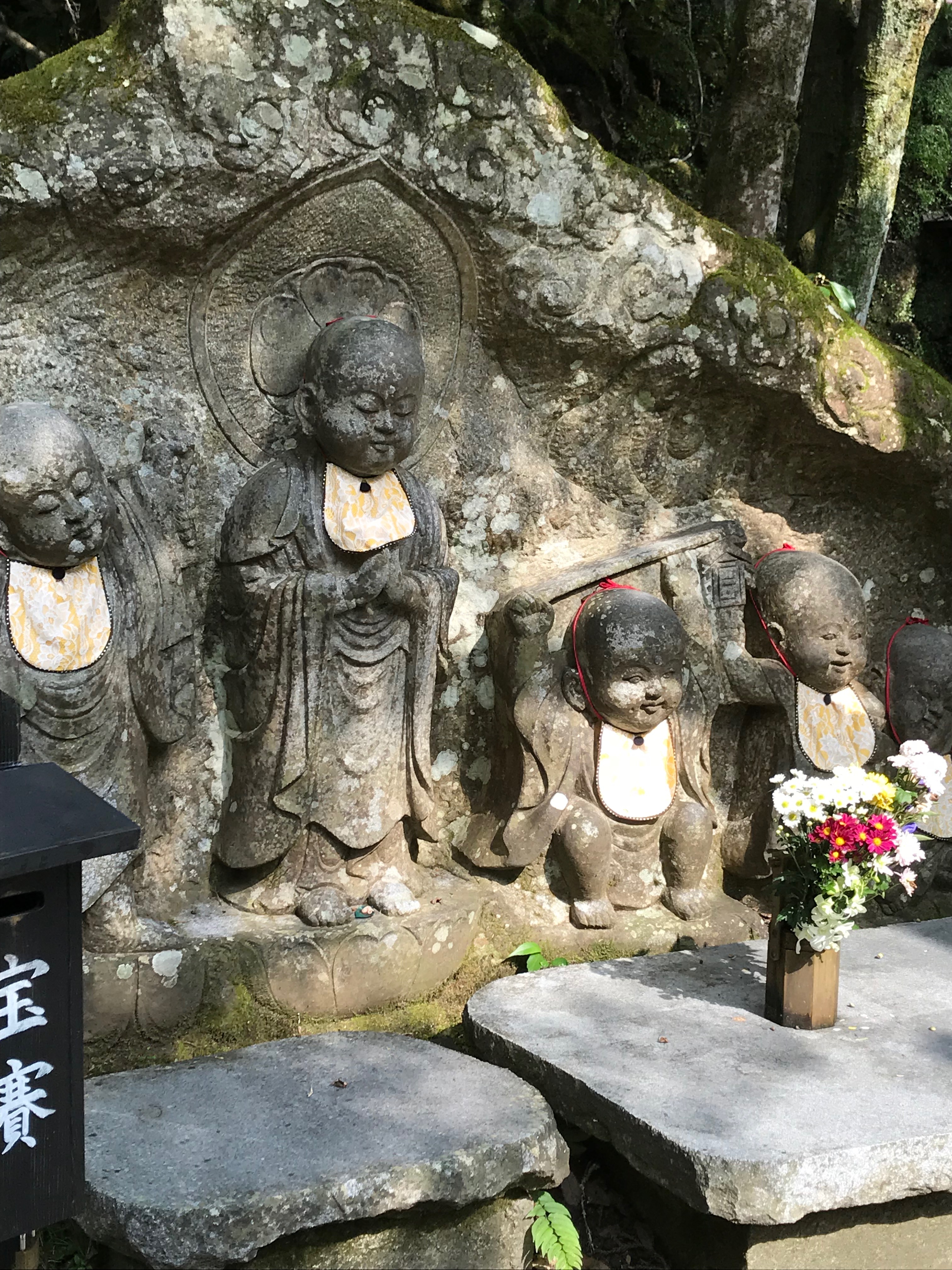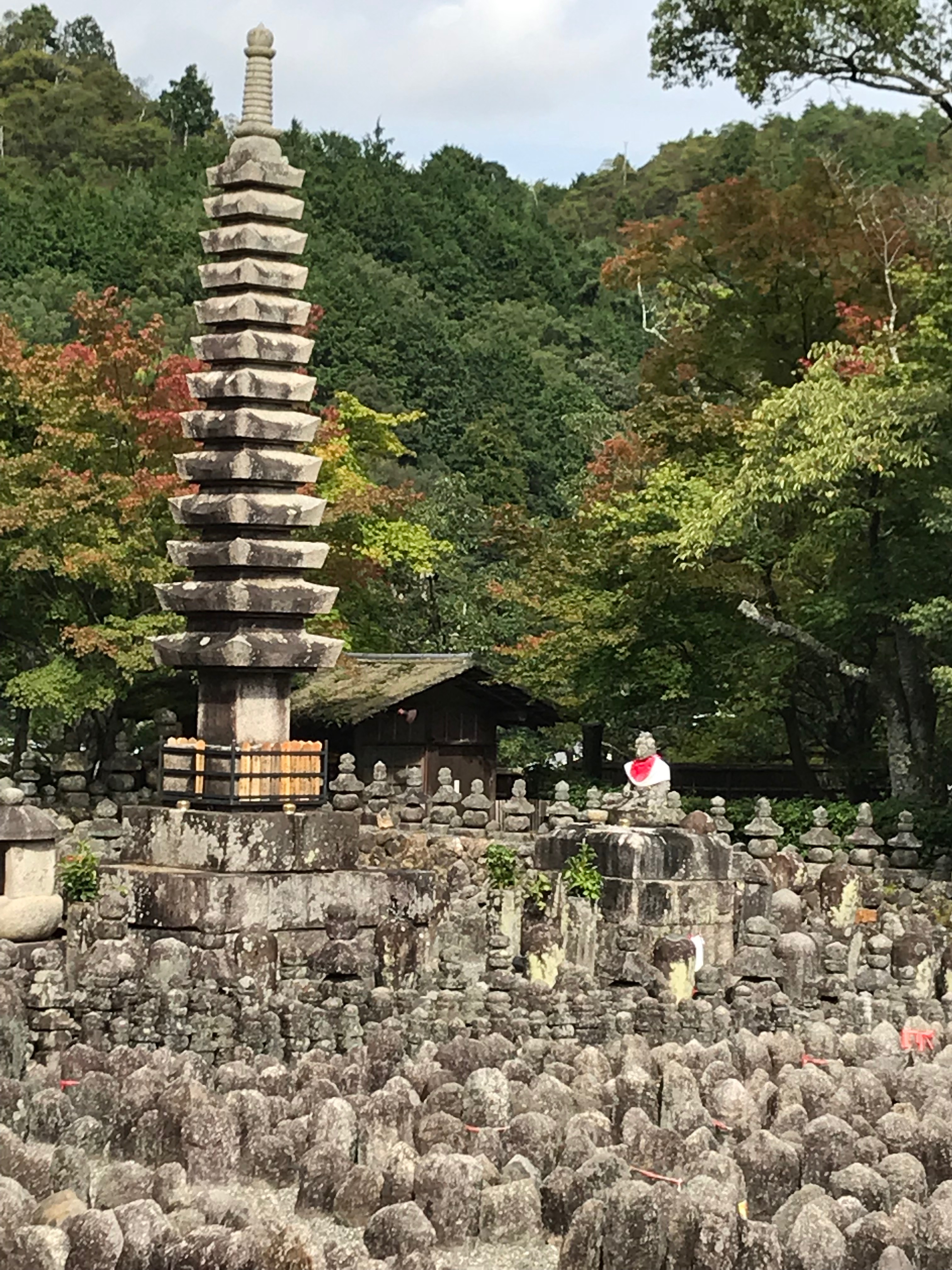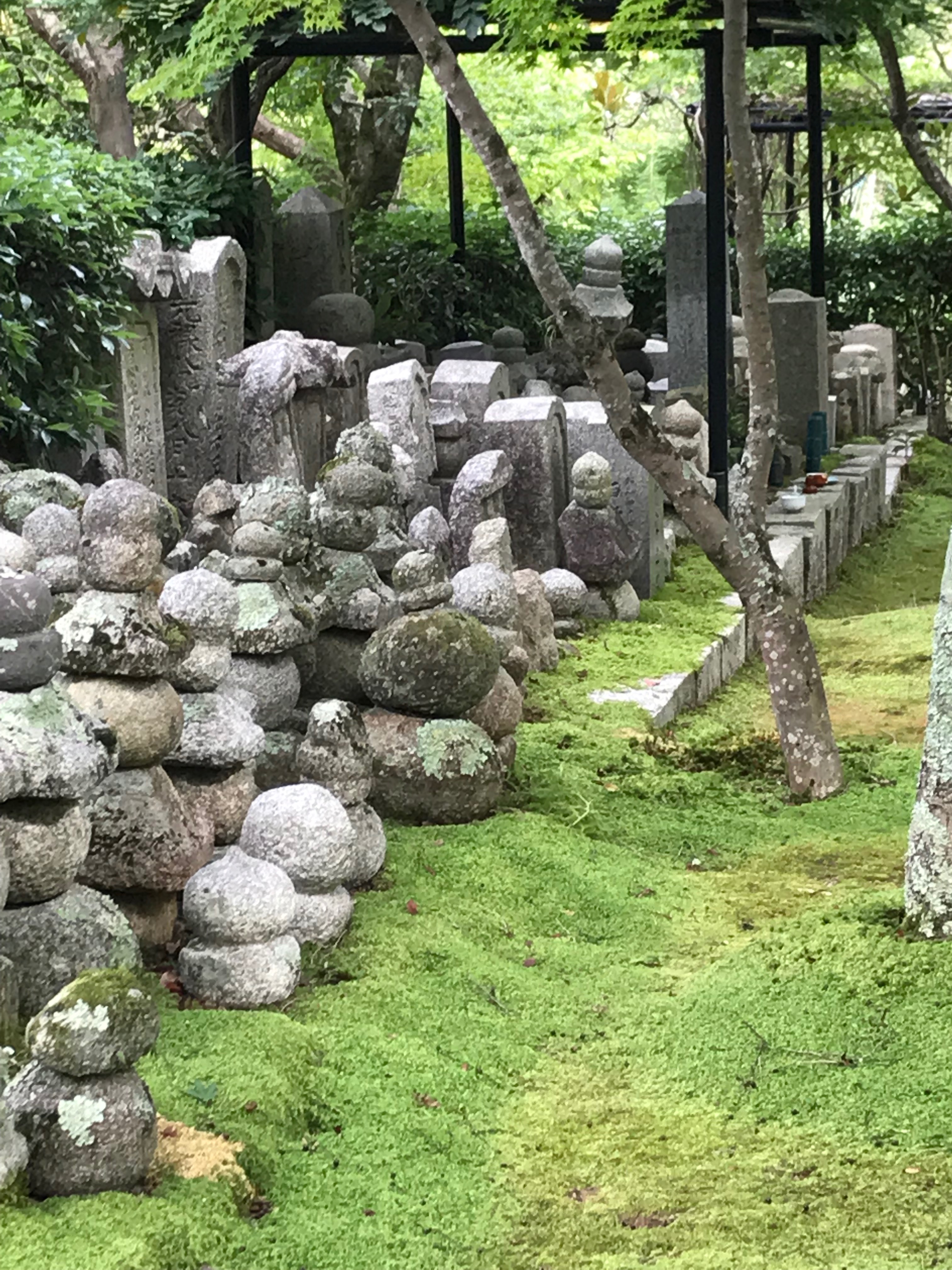 The weather slowly improved as we decided to trek on to Adashino Nenbutsu-ji, almost to the top of the hill. The guidebook called this “rather unusual” and where the abandoned bones of paupers and 8000 stone images (which had been uncovered about 100 years ago, having been discarded or buried, unclear) were dedicated to their spirits. Lonely Planet said “not a must see” but “interesting.” We beg to differ on the category. This was one of the most moving, beautiful, holy places we have visited anywhere, with powerful and intense spirits.