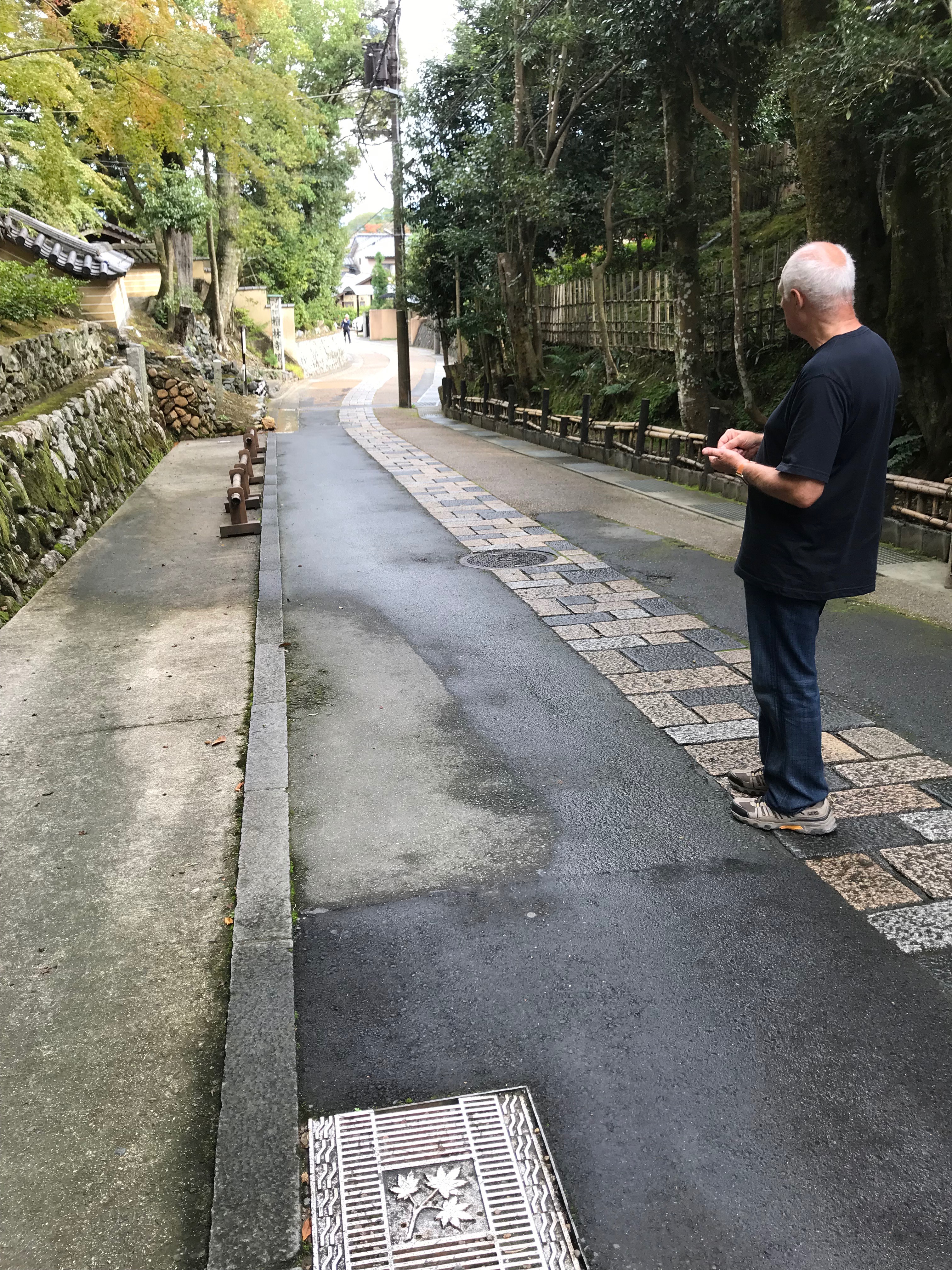 I could call this “suggested wallpaper/screen savers” and I suspect David and I will be rotating several of these for just that. While we were there we saw gardeners working, sitting or kneeling pulling up the tiniest weeds and raking up, with mini-bamboo rakes, the smallest leaves. Their care certainly shows. The north exit of the temple takes you right into the famous Bamboo Grove, which is pretty cool but was also filled with visitors taking pictures. We walked through but kept going, and as the route goes gently uphill, and the day was cool and a little drizzly, we were rewarded for our energy by ever dwindling fellow visitors.