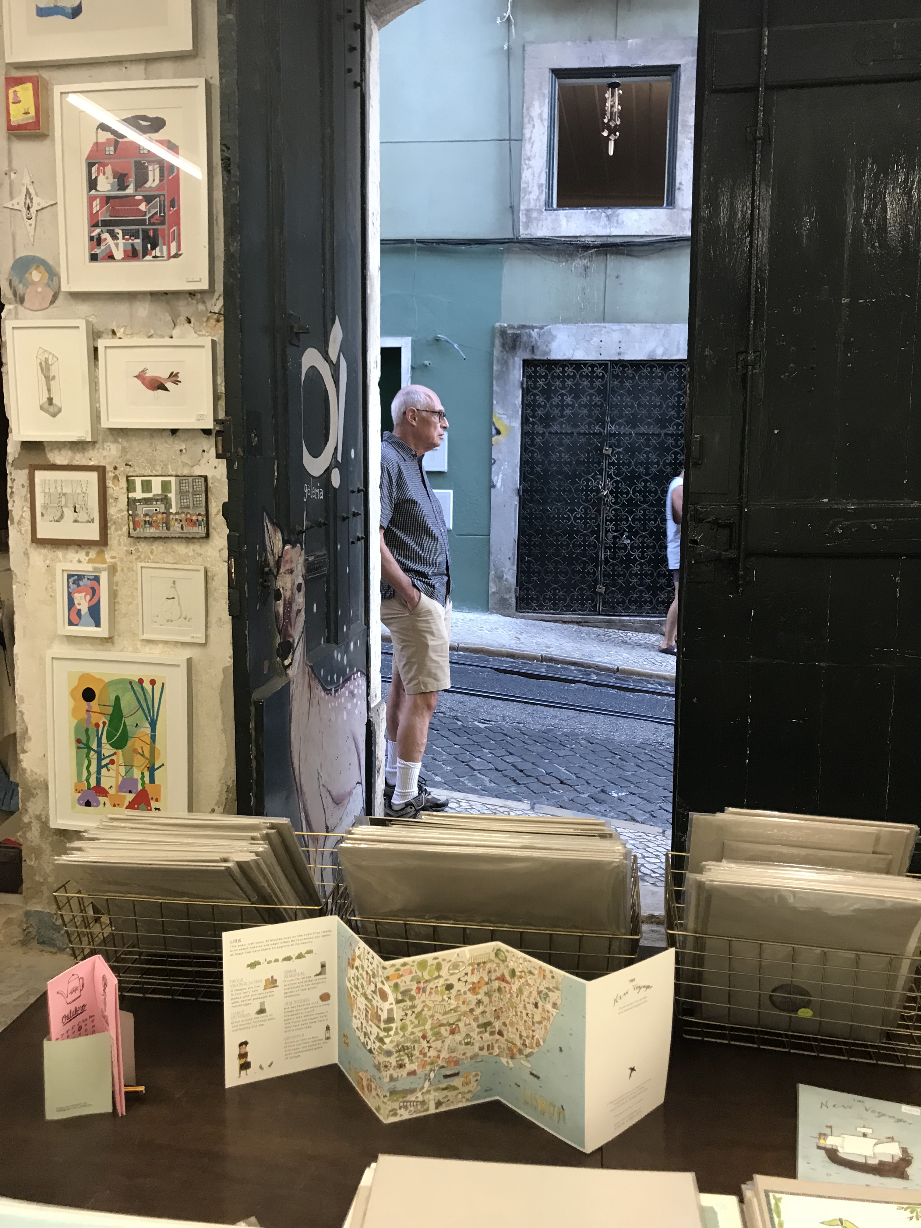 Our apartment is modern and sparkling clean…and after we met the host and she was finishing up cleaning (we came in as the previous guests were leaving) we fell onto the bed and were fast asleep in minutes–didn’t even hear her leave. Refreshed and ready to get our bearings we headed to a recommended restaurant but on the way encountered Mercado da Baixa, a cluster of vendors of food, wine, sangria, crafts, and jumping with locals and tourists. It looked like such fun and we were so hungry we dove in. Little plates of cheeses, meats, bread, some with tiny cups of fruit jam to spread on the cheese, sandwiches of ham and spread with strong white cheeses, cups of olives, all sorts of nuts and dried fruits, recorded fado serenading the noisy eaters, boys on skateboards, German tourists drinking teeny cups of orange liqueur chased with huge glasses of beer…on a still hot evening it was a welcoming and welcome party.
