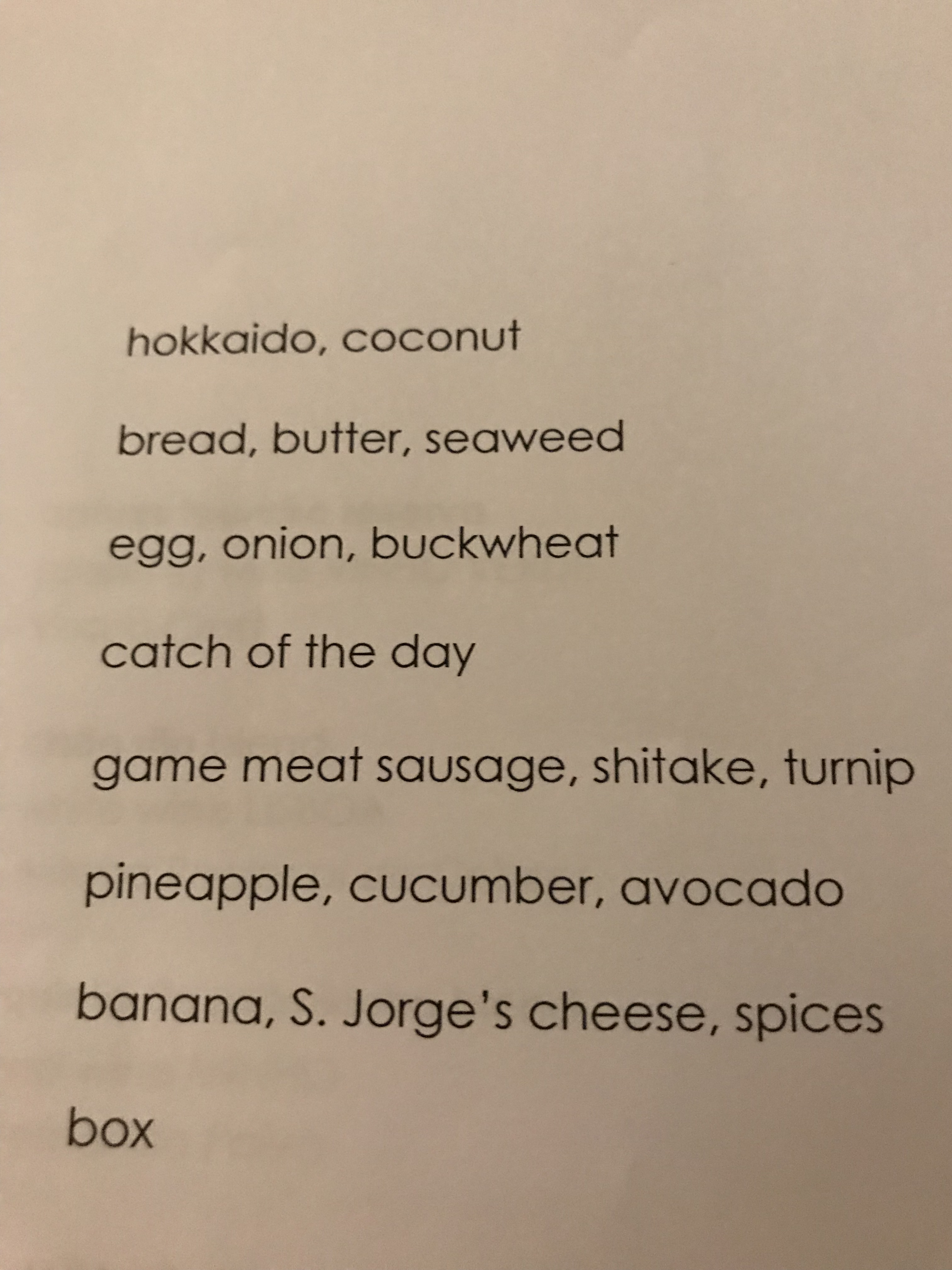 I include the menu because the food was not at all recognizable (a few photos below). Wine pairing was really fun. The first was a truly flavorful sparkling wine (all were Portuguese), the vinho verde marvelous, the first red blend we loved (second one less so) and the fortified wine very much like a Madeira. All were surprising and creative!