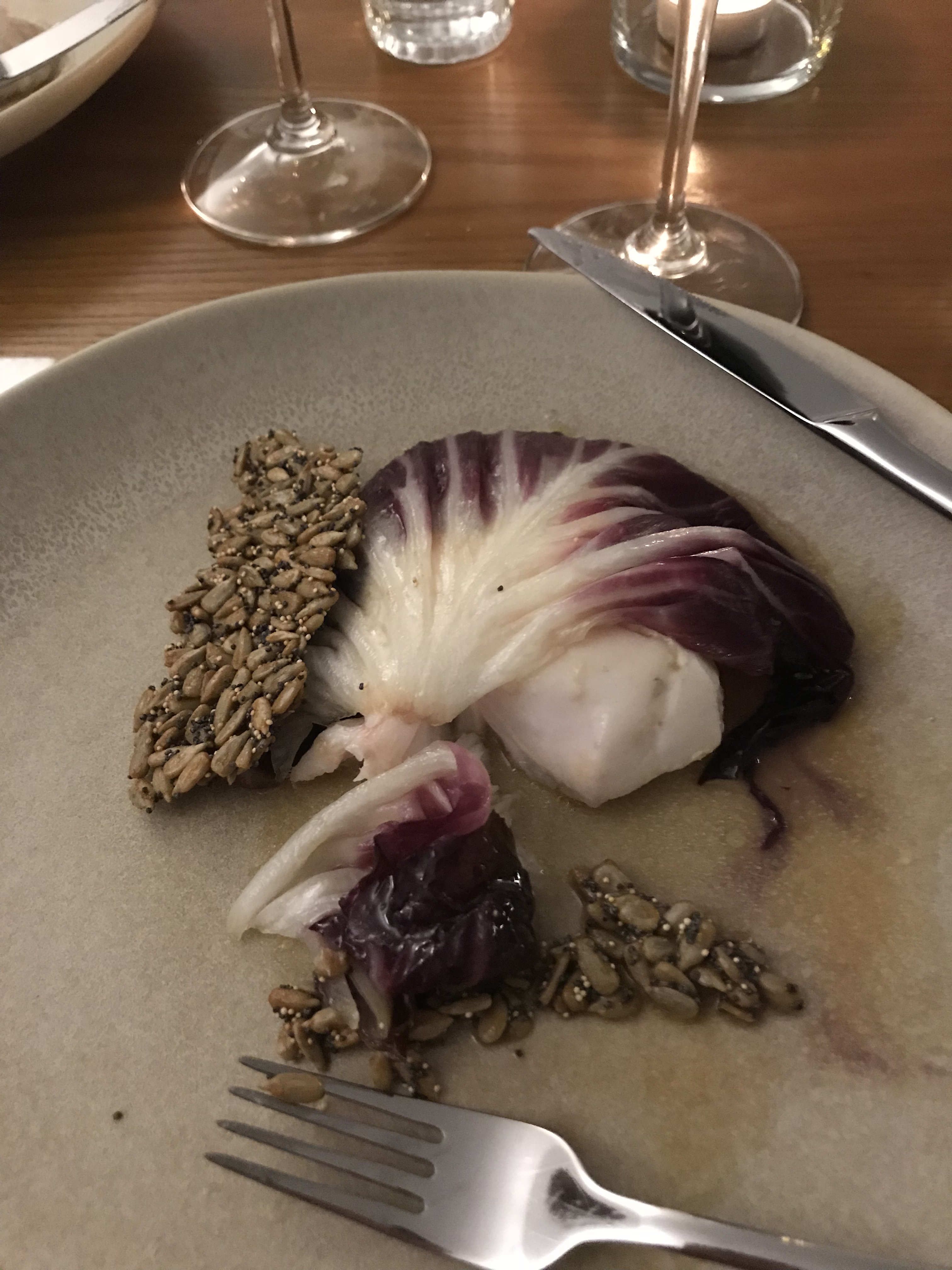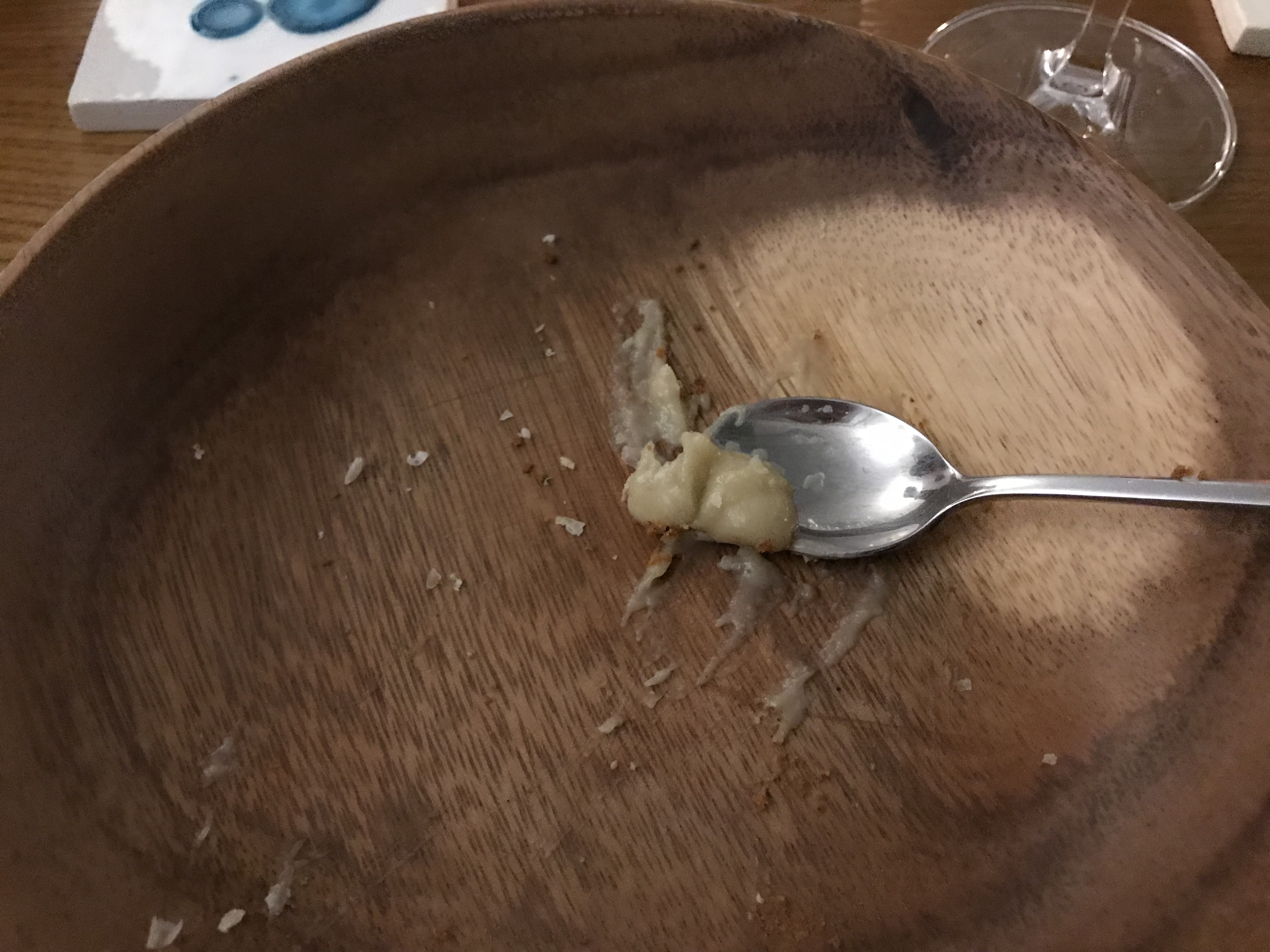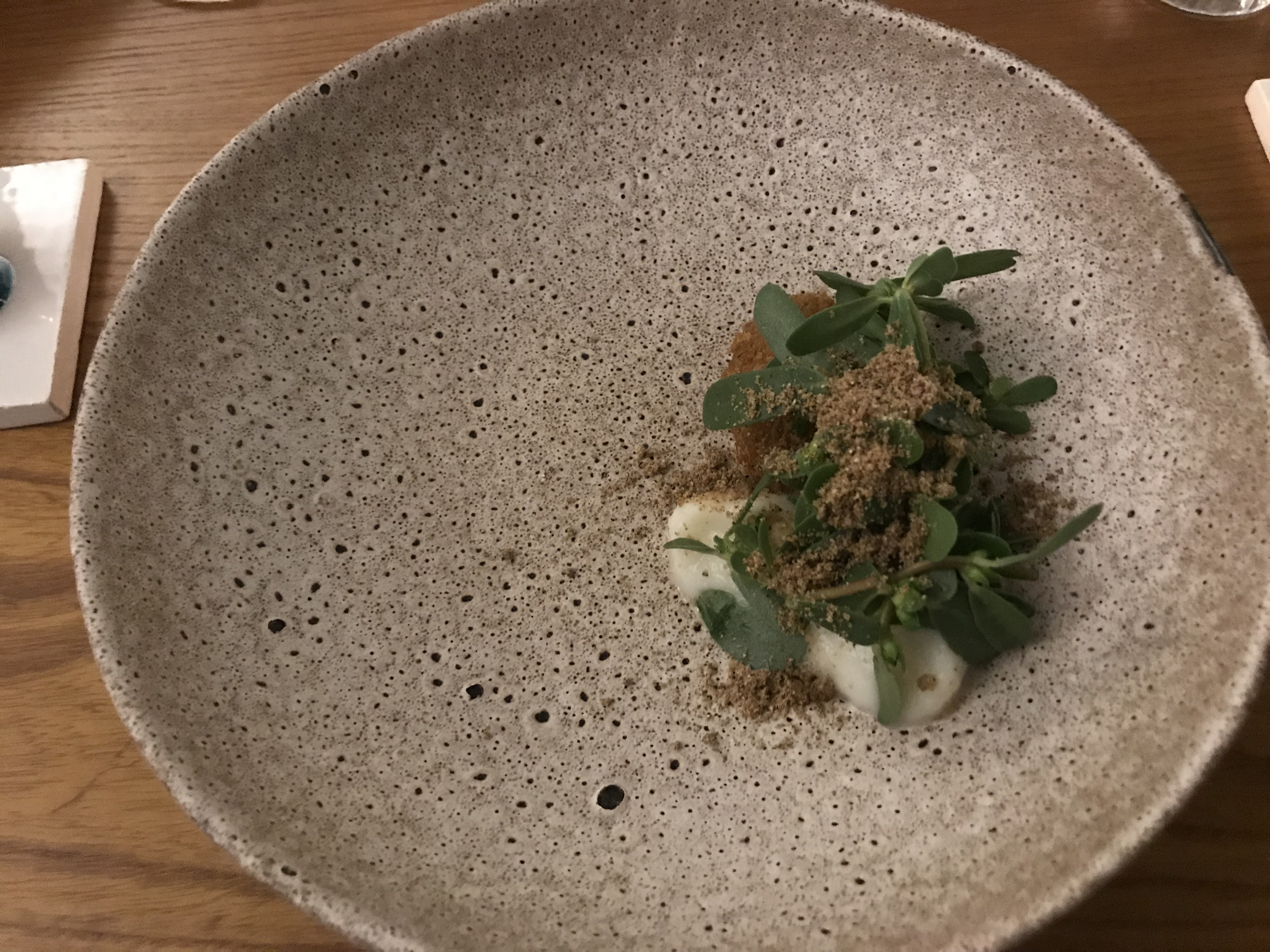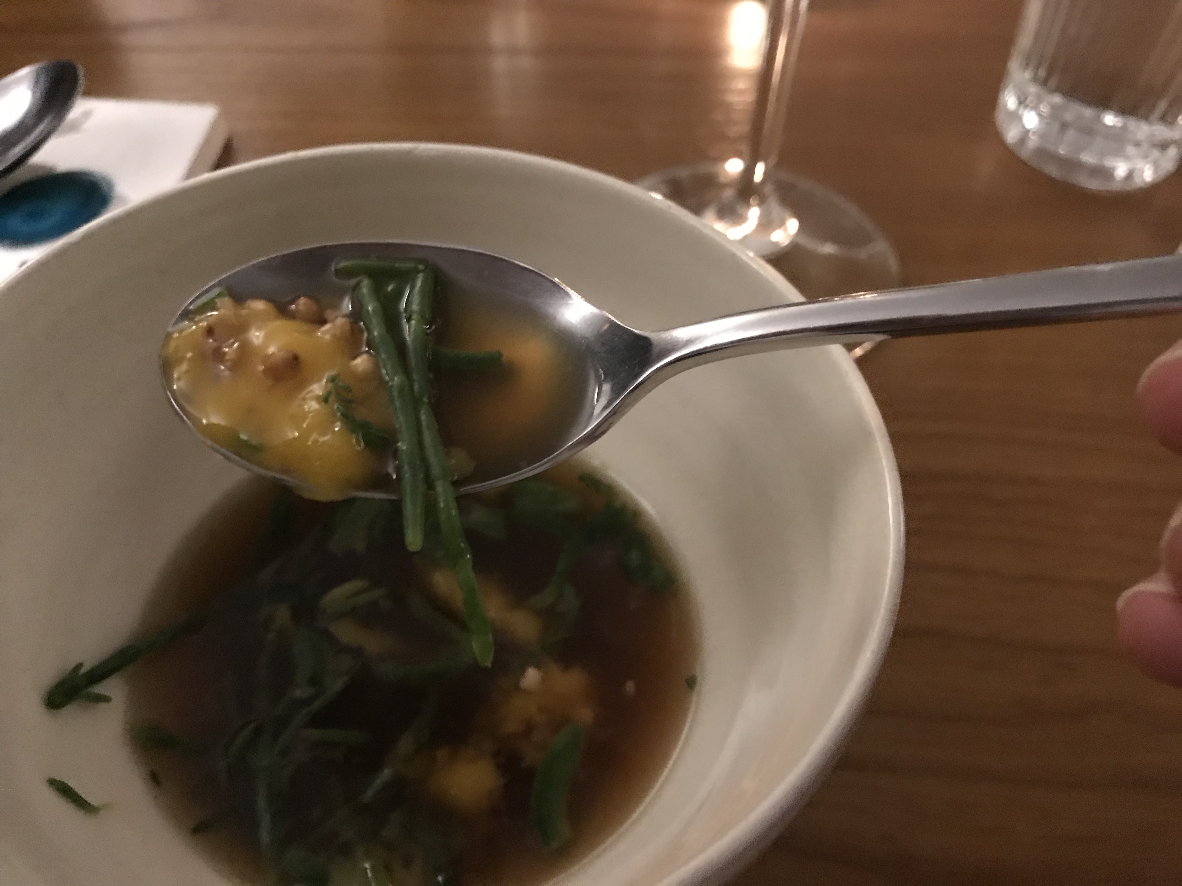 “Bread, butter, seaweed” turned out to be a small half loaf of sourdough bread made with dark beer (?), a butter so good it was how you think butter should always be…and we finished it plain when the bread was gone, and a chopped seaweed, capers, mustard combo to put on top. Yummy.