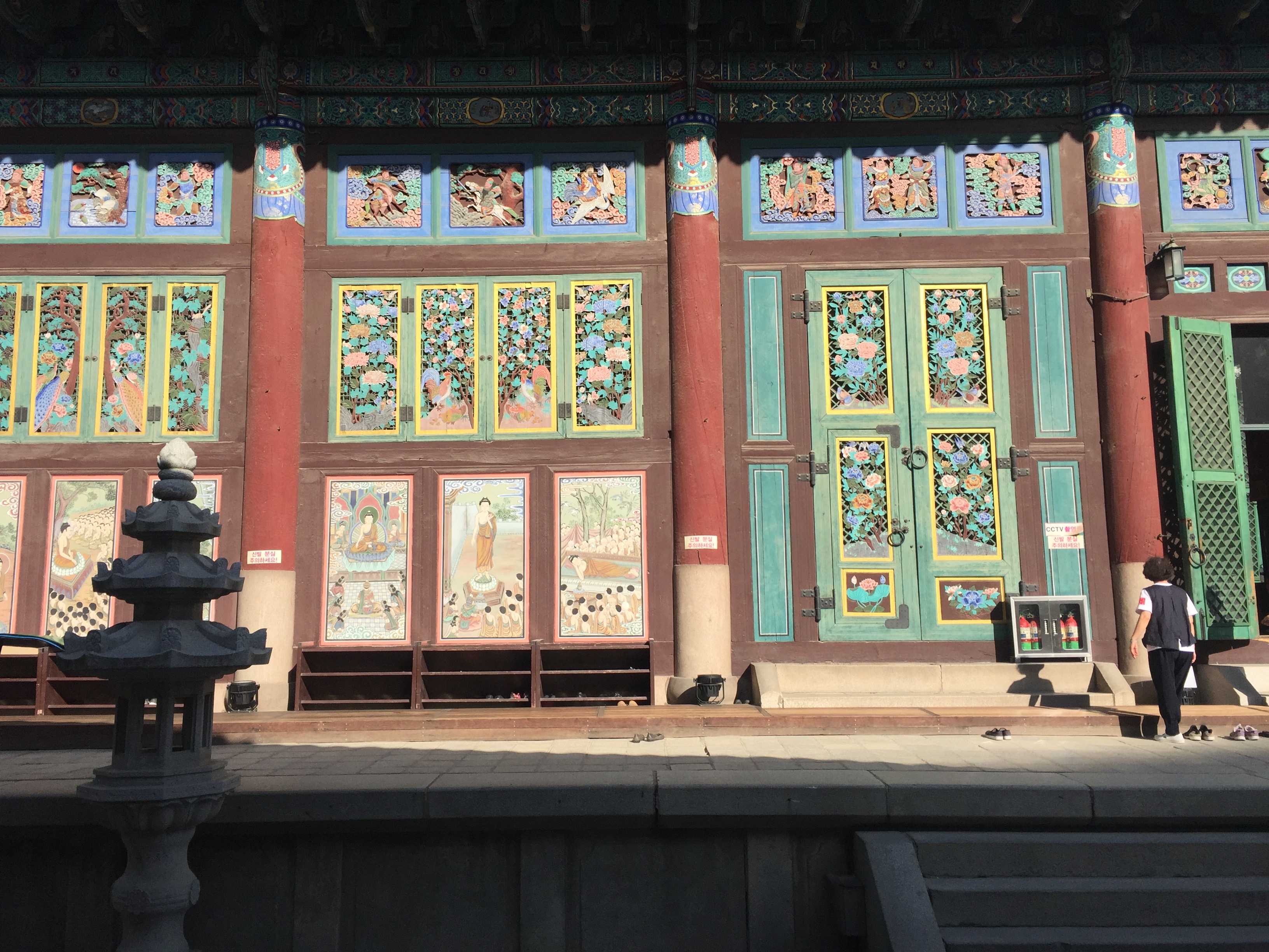 We were hot and sticky and tired, but headed 5 long blocks or so to one of the palaces which sits right in the center of downtown, a shady complex of pavilions and other royal buildings, all painted in vivid designs along the rafters, and inside several were contemporary art installations that represented the mix of past and present day Korea. One was an entire wall showing overlays of a multi-story pagoda and modern office buildings, with the ghost of a train moving across the bottom. Stunning and evocative.