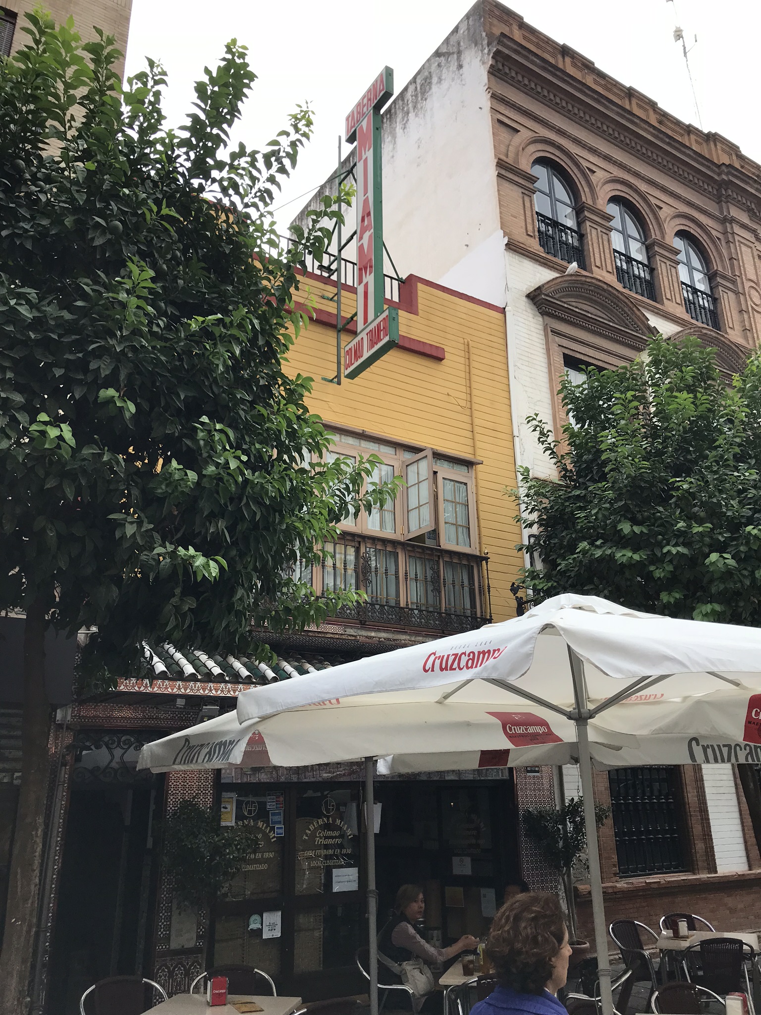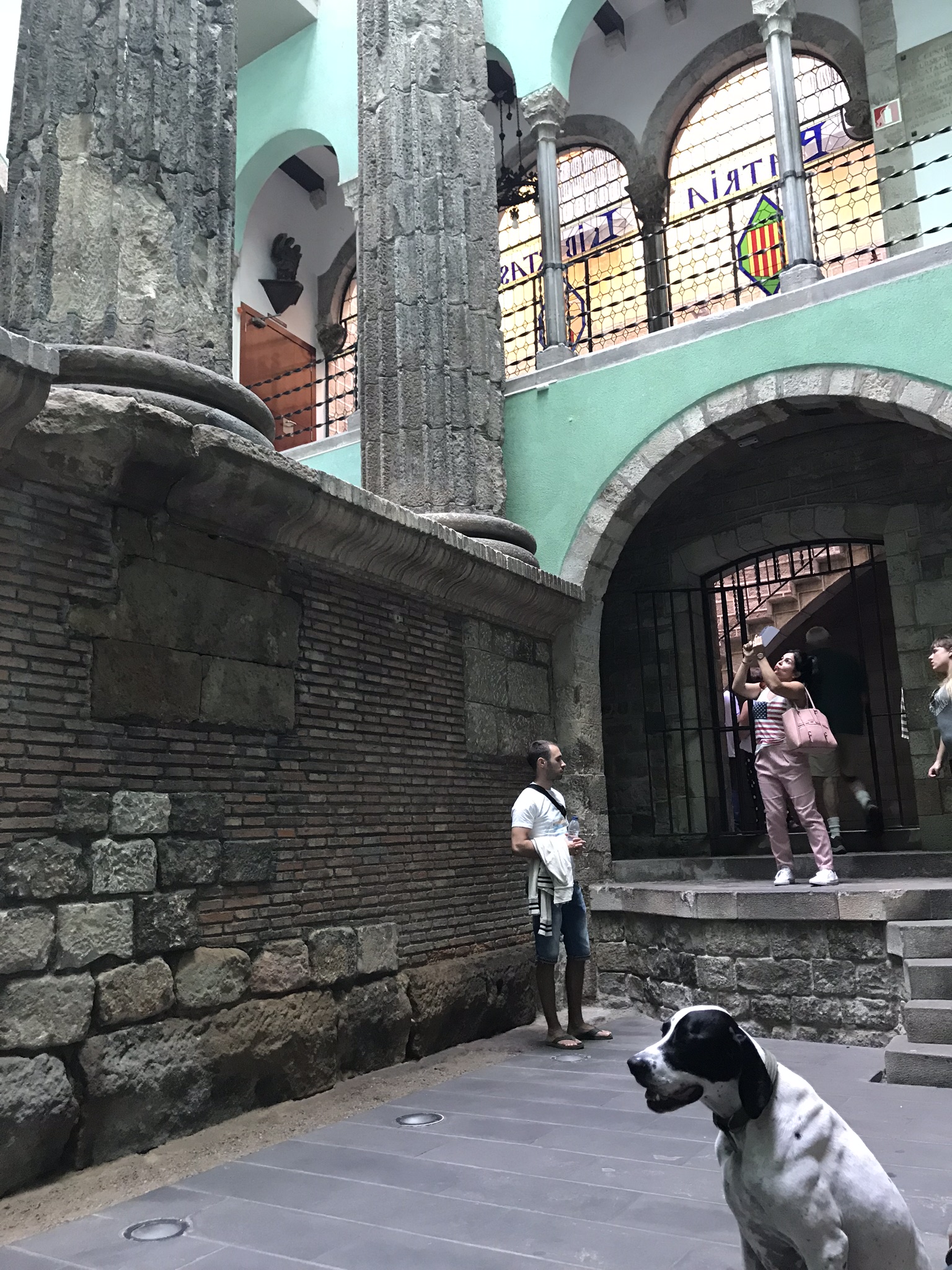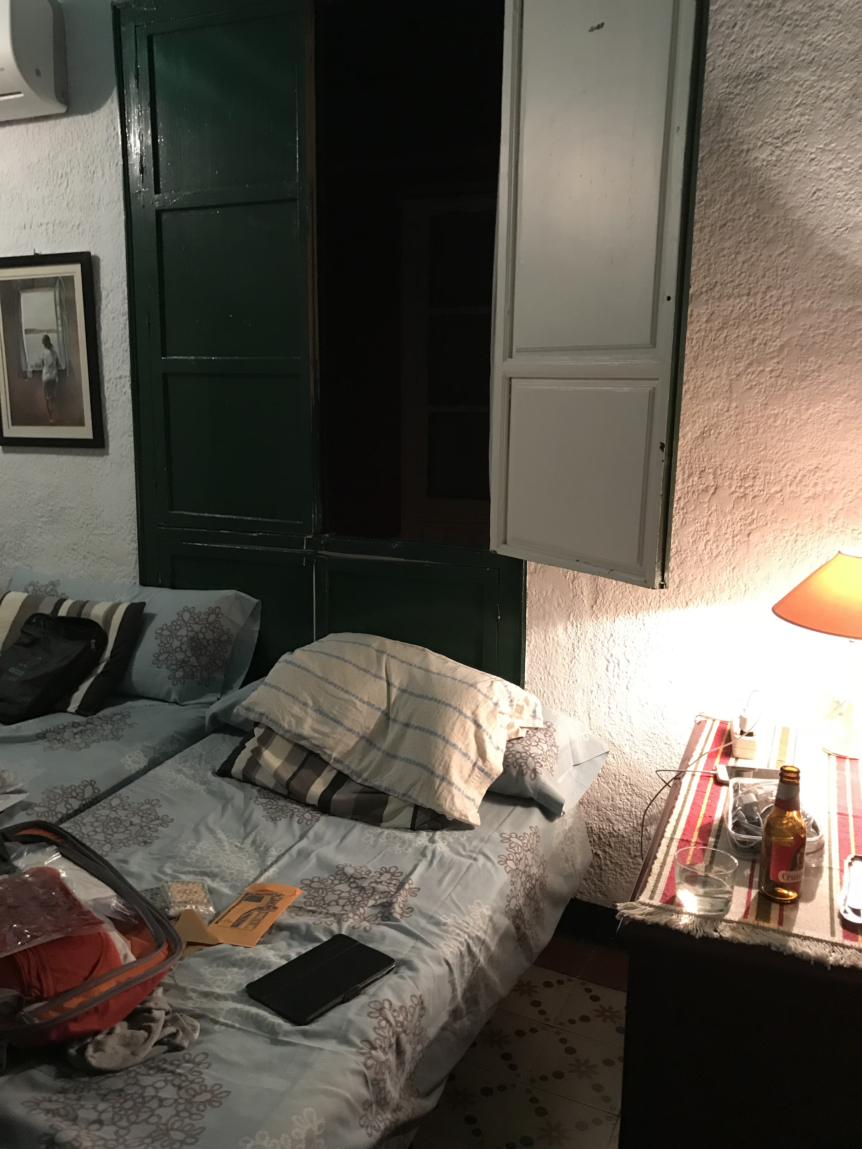 Yikes. A large and crazy plaza where several streets crisscross at acute angles, both pedestrian and not, a gazillion people, but all we had to do was make sure we remained on Calle Mayor and in 10 minutes we were at our address. Alas, we were early by about 45 minutes–Roberto would meet us outside and take us up but not until 7:30. We were so tired and hungry and thirsty…looked up the street a short block and there was a bar where people were sitting in a little enclosed patio smoking and drinking.