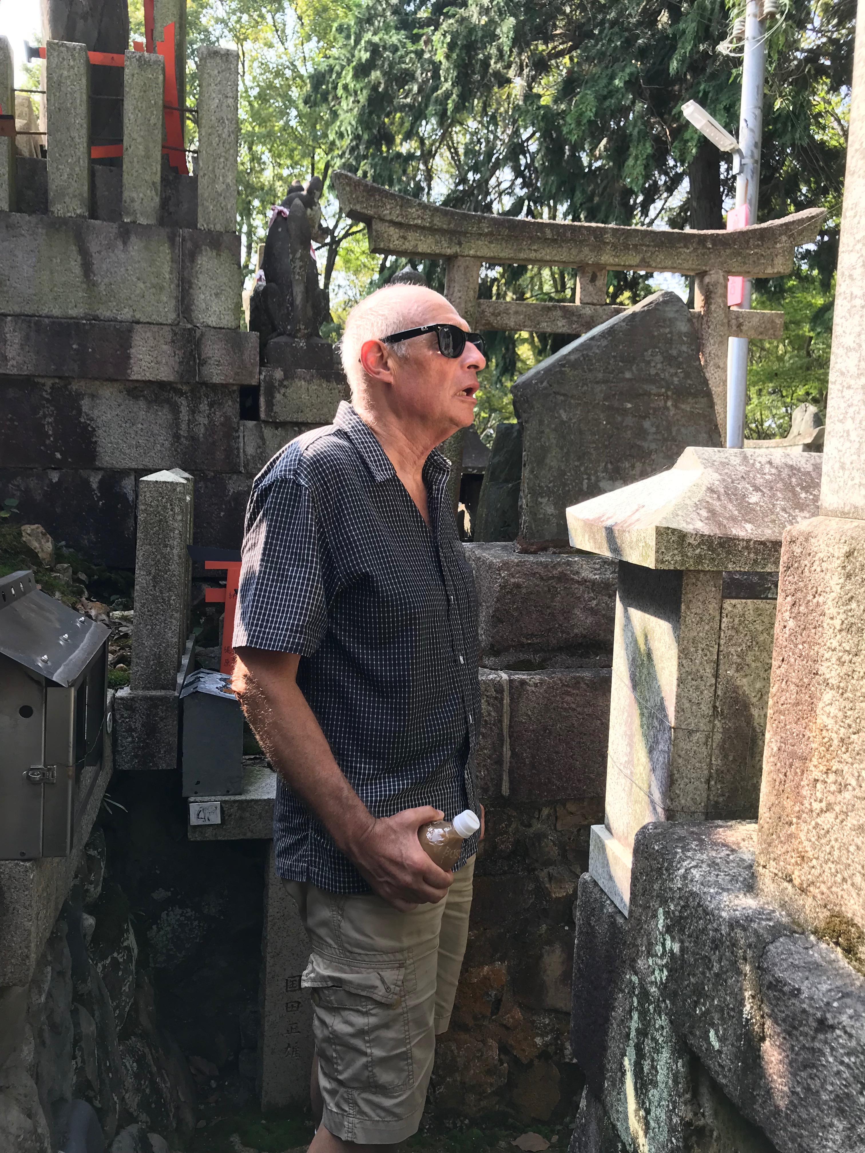 Both countries have gazillions of drink vending machines, and in both countries cold coffee in various versions and brands are ubiquitous. When you order coffee at a stand or in a bakery or cafe (cafe=coffee) you must state whether hot or cold, unlike in the US where coffee is hot, and iced coffee is iced coffee. In both places you find drink vending machines in out of the way corners, at public parks or shrines and temples, and in Japan we started noticing that prices varied quite a bit with the same drink, same size, sometimes as cheap as a dollar and sometimes as expensive as two dollars or more. Occasionally there was also a place to put an empty drink container near the machine. At the top of Inari there is a vending machine and next to it in the little wooden shop (where you can buy shrine-related tokens and offerings) there is a sliding glass door and a wooden table inside on which to put your empty. This is where I discovered Pokari Sweat, a sports drink that was perfect for a sweaty American on a hot and humid day, and was especially grateful a woman showed me where to stow the empty can.