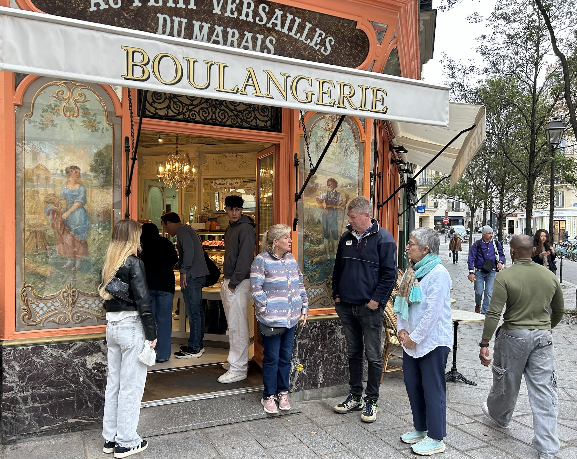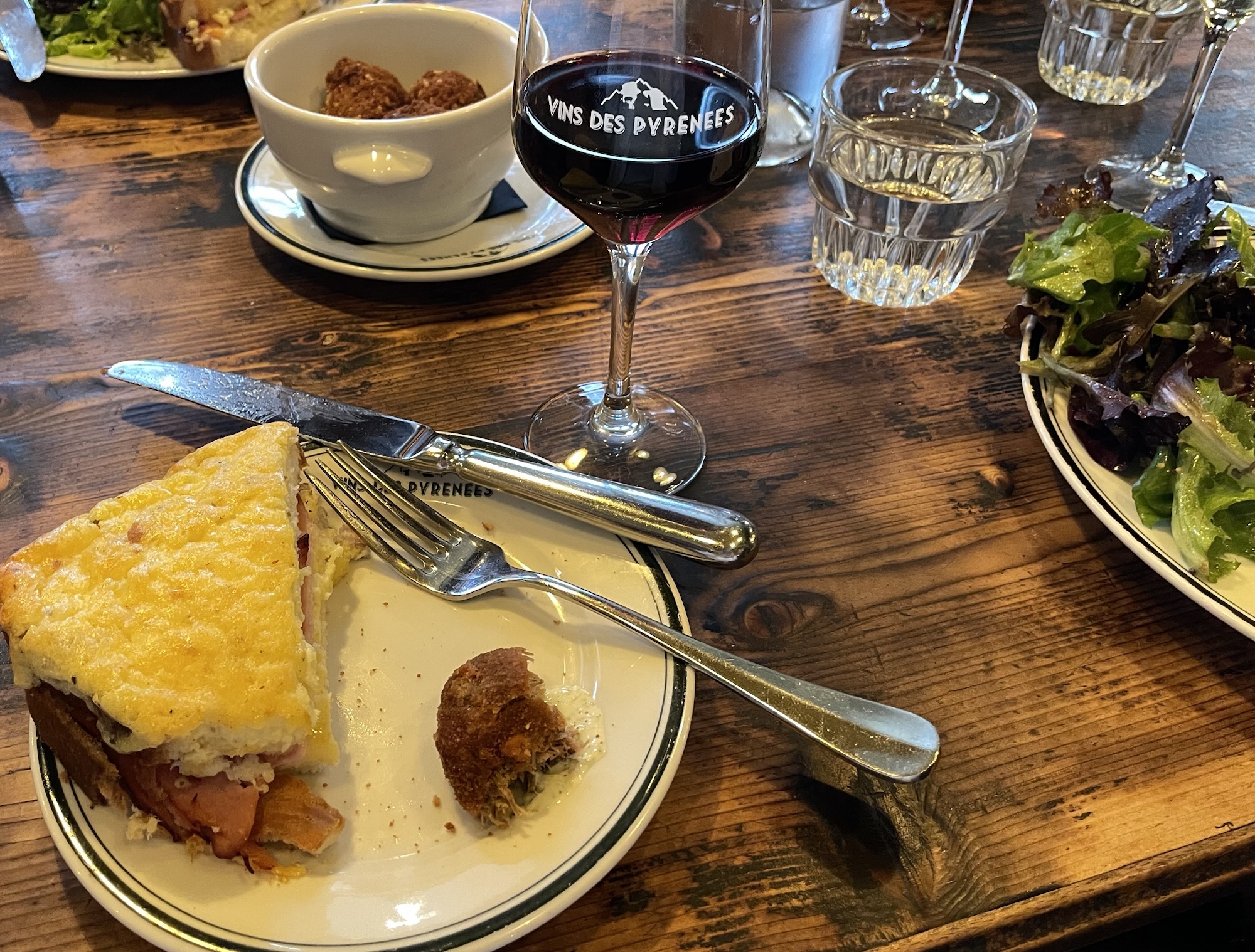 At 11am we met in Le Marais for a food tour through Viator. First stop, a classic boulangerie, everyone got either pain chocolate or a croissant. You know David had the pain chocolate as he has had every morning since. Following a little talk on boulangeries, historic preservation, and a some Le Marais background we walked to a fromagerie, Laurent Dubois. The owner also ages cheese for other cheese makers (I have read about this—you must have very specific attributes to age cheese…temperature, ambiance, skill). The owner has won the annual award for excellence several times, and has cases of his special creations out front. Our guide bought two cheeses, a comte aged 25 months (not exactly the same as what we get at Costco!) and a creamy, mild blue with two ribbons of hazelnuts, probably 5” high. You cut it like a pie. The guide had bought two baguettes at the boulangerie so we expected cheese and bread at some point. He walked us to a wine shop/restaurant, Vins Des Pyrenees, another award winner. A table was set for our group of ten, each place with two wine glasses. Uh oh. It was about ten minutes to noon! As soon as we were settled every two people had an enormous croque monsieur delivered, fortunately cut in two to share. I personally could eat about half. THEN we had two wines, something red I don’t remember (very good) and a delicious viogner. We were presented with the two cheeses and sliced baguettes! So much food. The blue with the viogner was recommended and yup, so good.