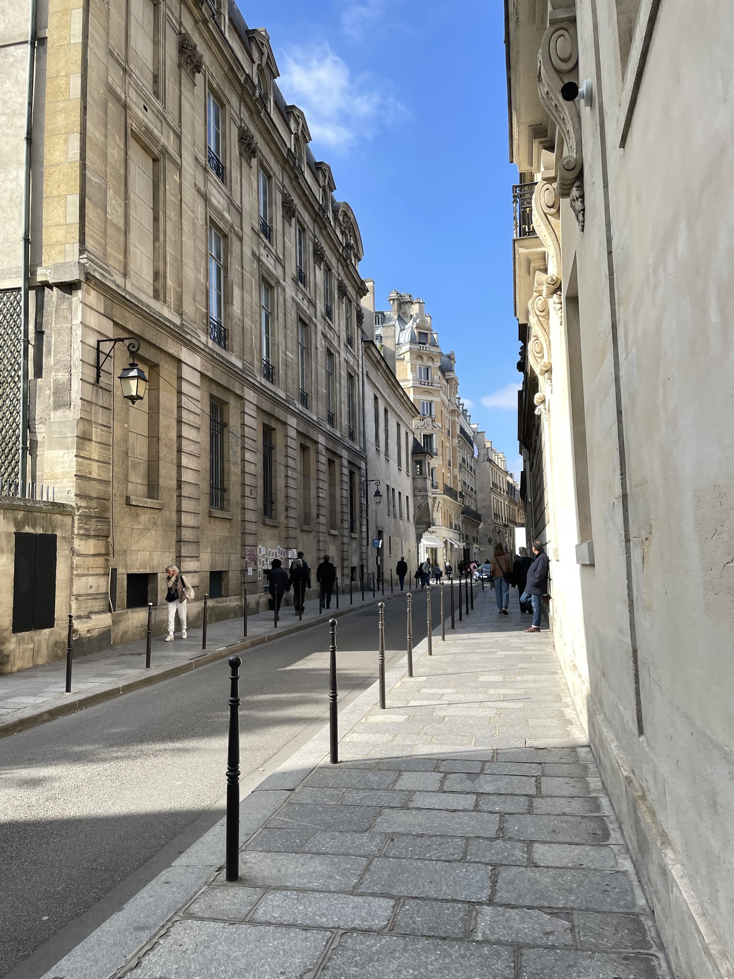 Our assignment from Merci was to find a tote bag, apparently something that went viral and comes in a bunch of colors and is not expensive. Sure! Then we agonized over the colors but settled on brown with the name Merci in dark blue. As we were ringing up I asked the (of course lovely and sweet) young woman at the counter where we could get the skin care stuff. When she saw the list she said any “Pharmacie” would have it all. Super! Our other assignment was to find a Kutjen store–tiny boutique stores that sell cashmere things. One of them is in Le Marais, so off we headed to our favorite wandering- -around neighborhood. We were, it turned out, on the edge of Le Marais so decided to walk.