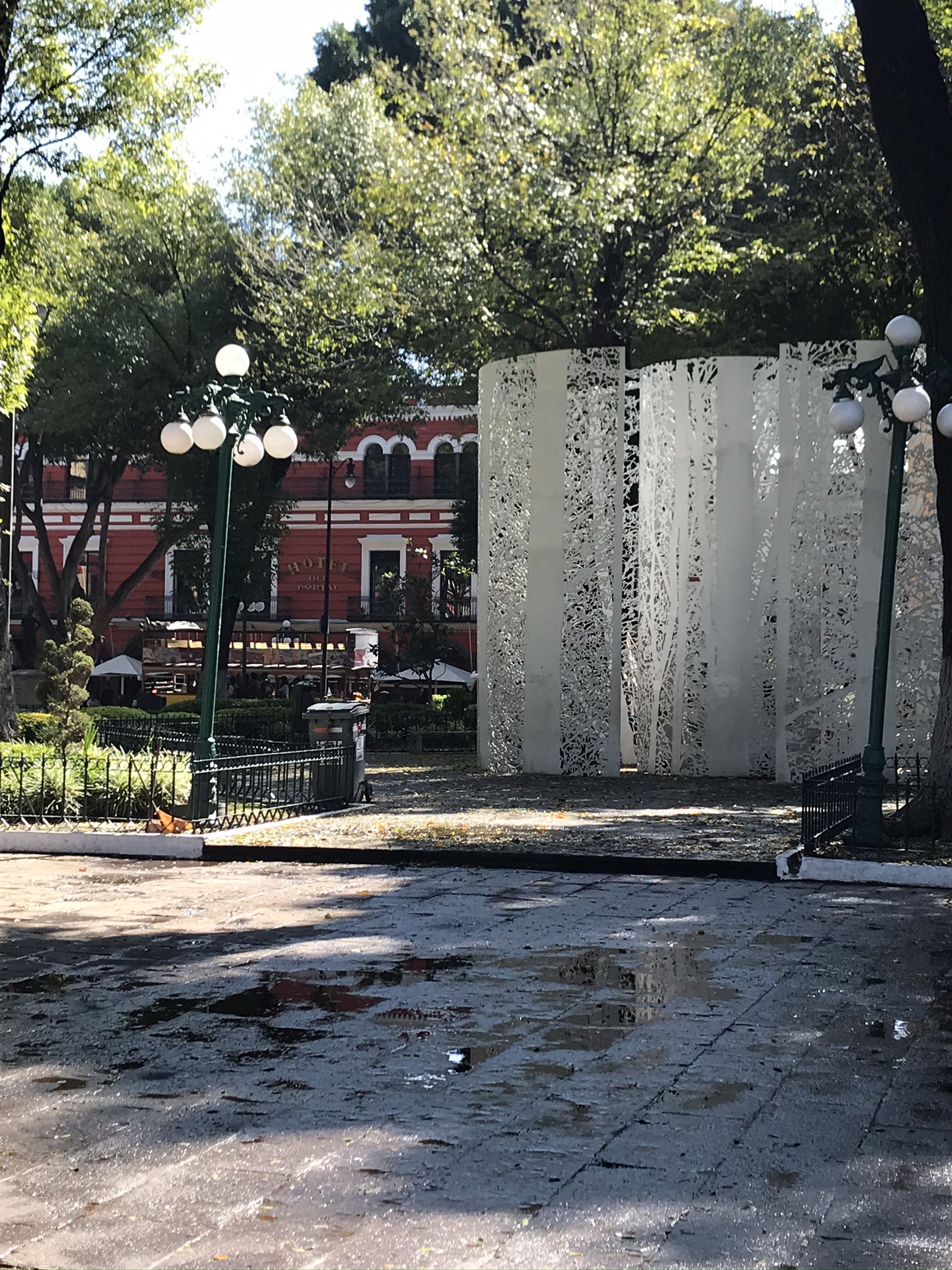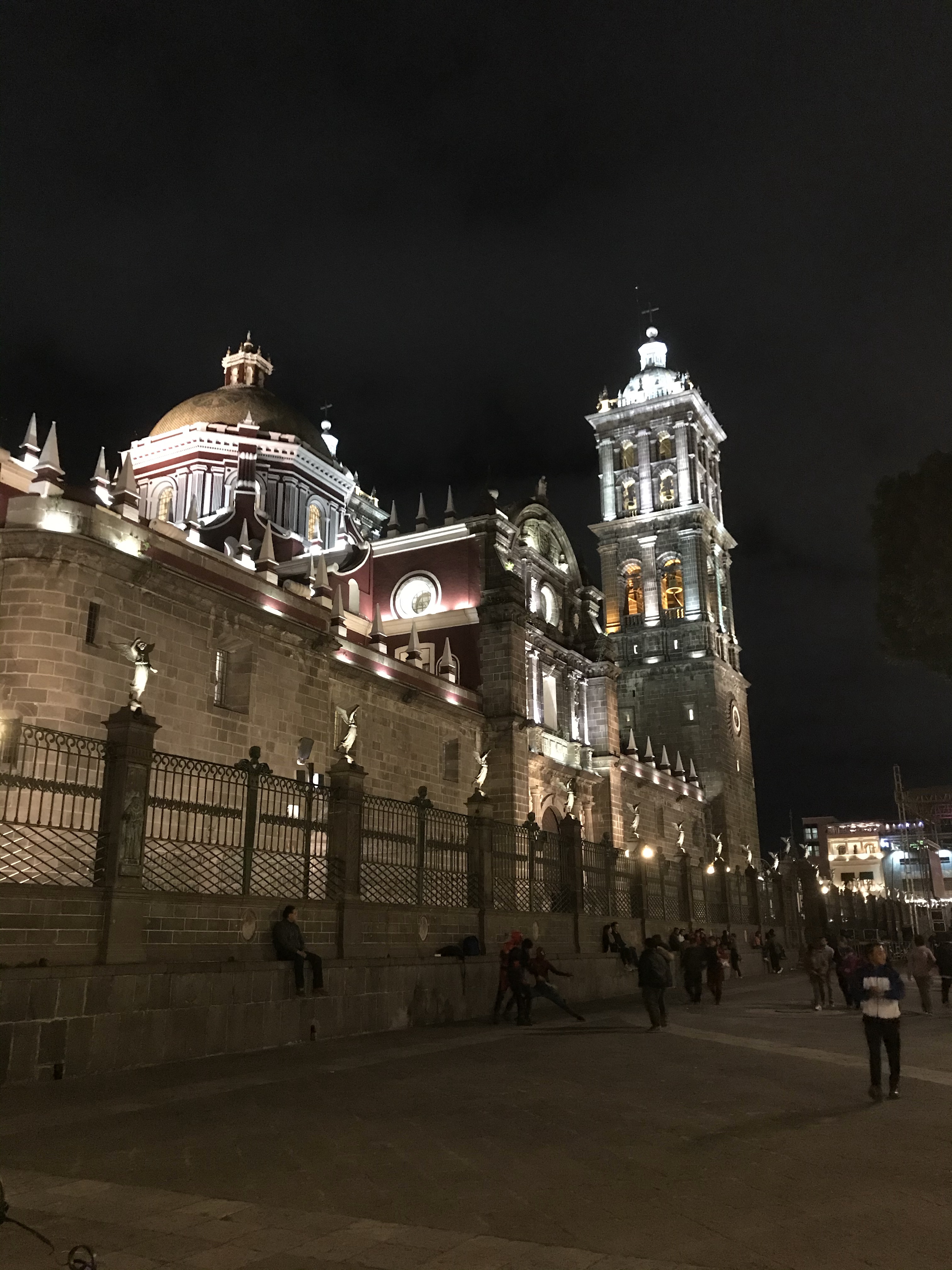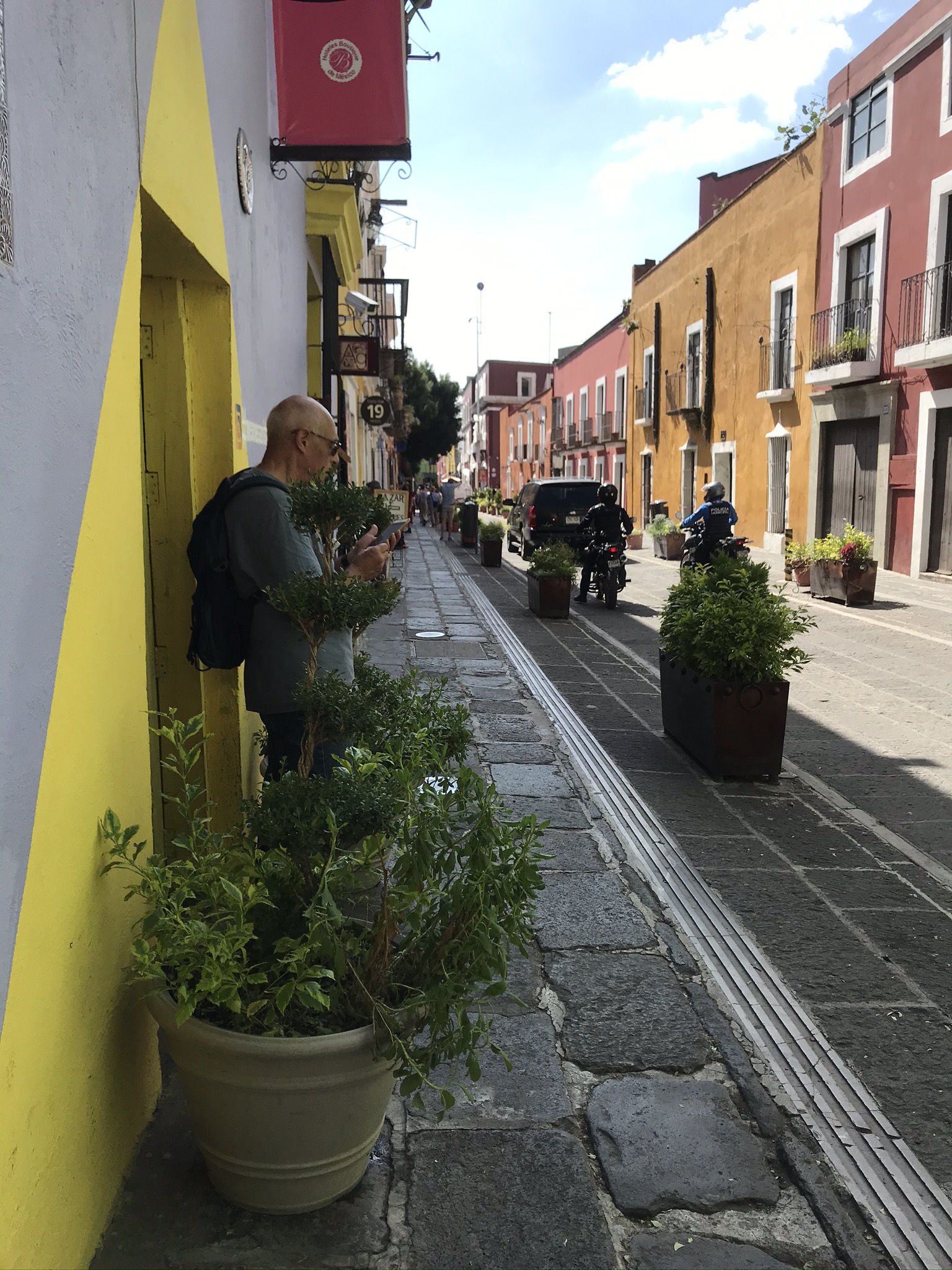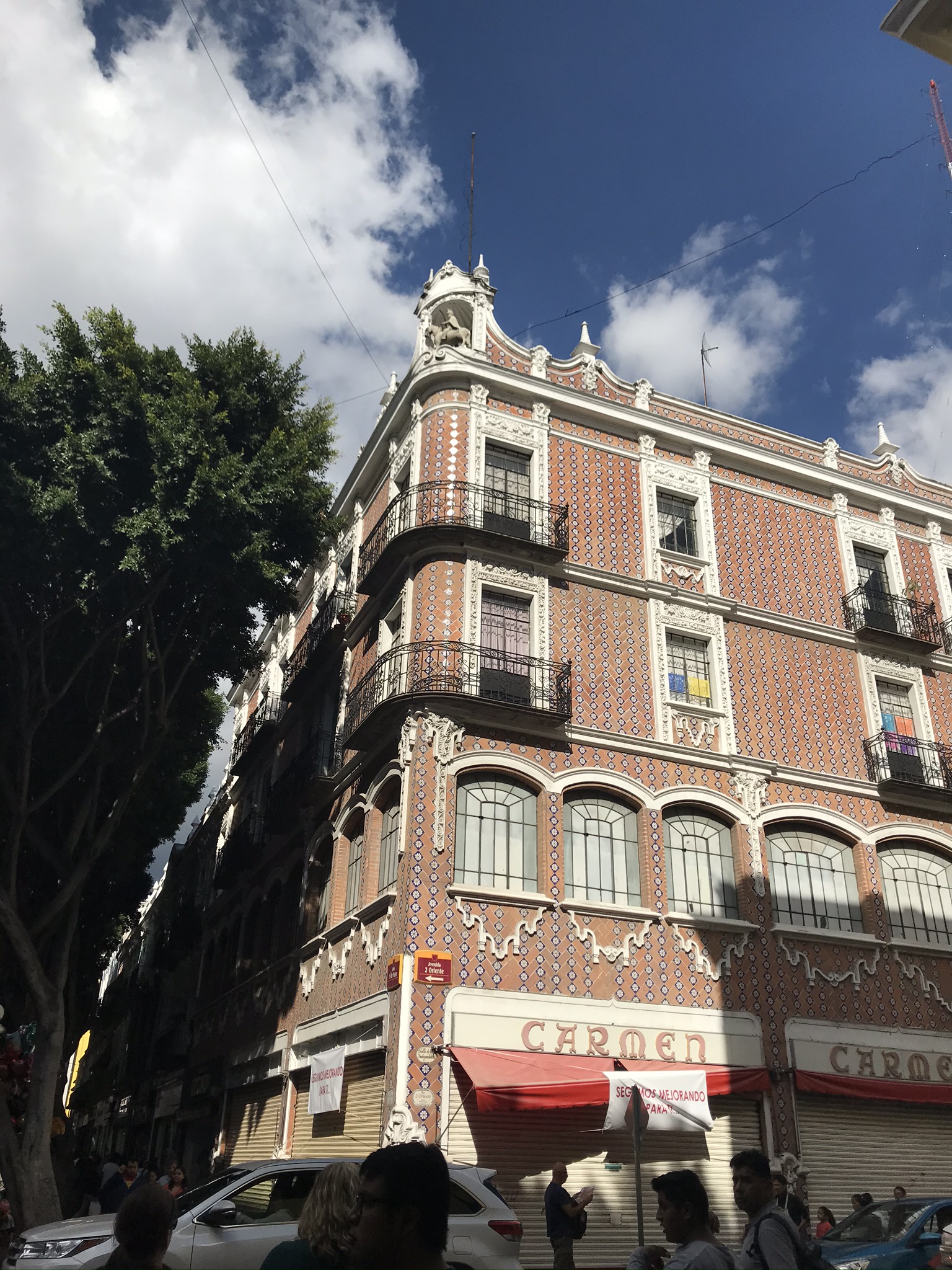 As we sat down at the empty table we were able of course to watch all the cooking—it was literally right in front of us. One woman was making tortillas from a pile of masa harina that must have been a foot tall and a foot wide. As she removed the tortilla from the press she passed it back and forth from hand to hand—exactly the same technique I had watched recently in a video about making naan. Each tortilla puffed up as she moved them around the grill. A second woman was chopping onions with an enormous knife. The third was cooking cemitas—she took 3 paper thin pieces of meat, probably pork, and slapped them on the grill. While the meat grilled she prepared the rest of the filling. The bottom of the roll was covered with avocado, strings of Oaxacan cheese (the only cheese we saw in Puebla), slices of onion, an herb papalo which is kind of similar to cilantro though unrelated, a good flavor and quite strong, and a handful of French fries. As you can see from the picture, it is enormous. I was unable to finish my half and I was so very hungry when I started! Anyway, this little place turned out amazing food and was always full—there was a “nicer” cemitas place next door which was empty as we walked by. What a treat. And our 100% good luck eating street food held—no after effects at all.